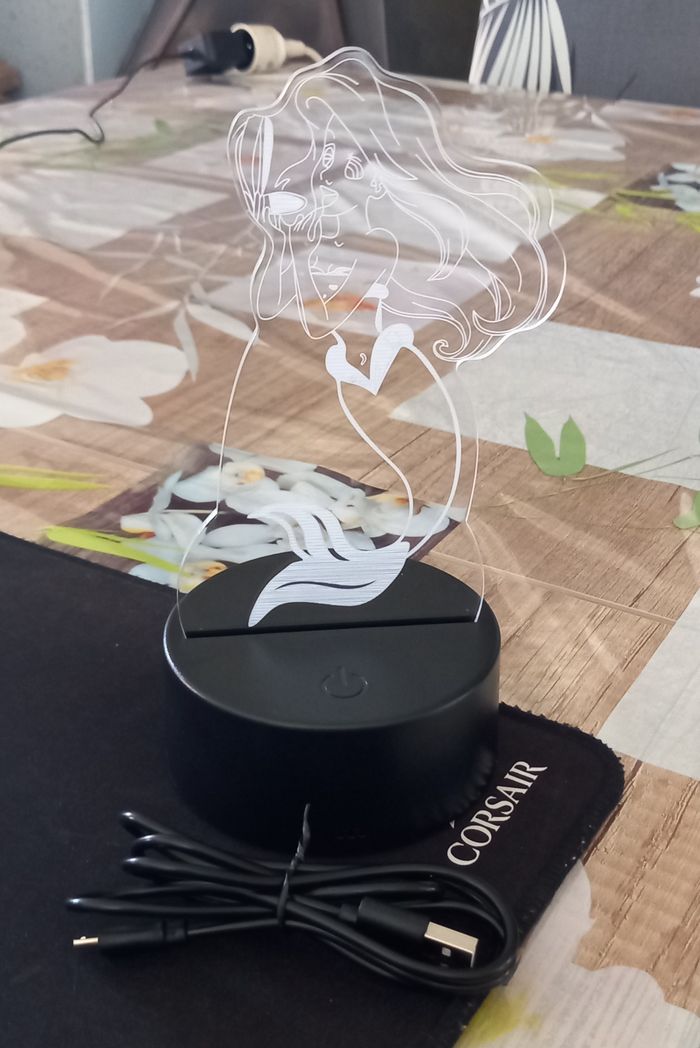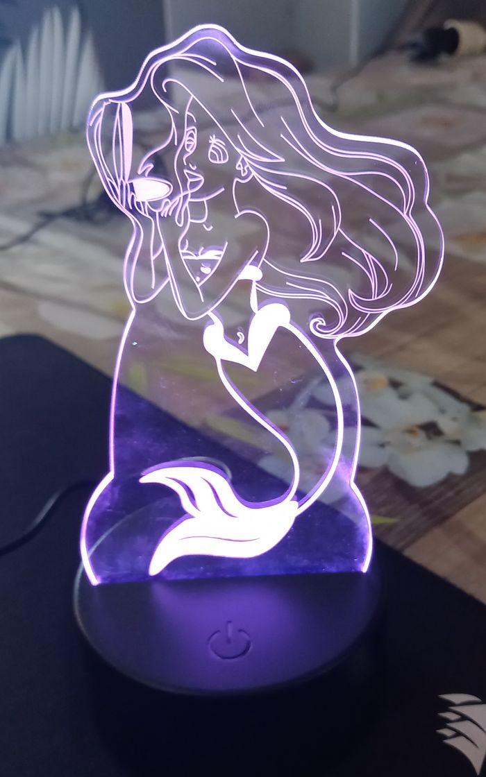 Lampe decorative motif Ariel la petite sirene. Dimensions du socle noir: 9,5 x 4 cms HAUTEUR TOTALE AVEC SOCLE : 19x 10,5 cms lampe LED AVEC BRANCHEMENT PAR USB ou 3 piles (non fournit) 7 COULEURS DIFFERENTES. NEUF LIVRE DANS SA BOITE. Envoi rapide et soigné. PRIX FERME.