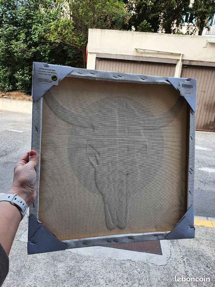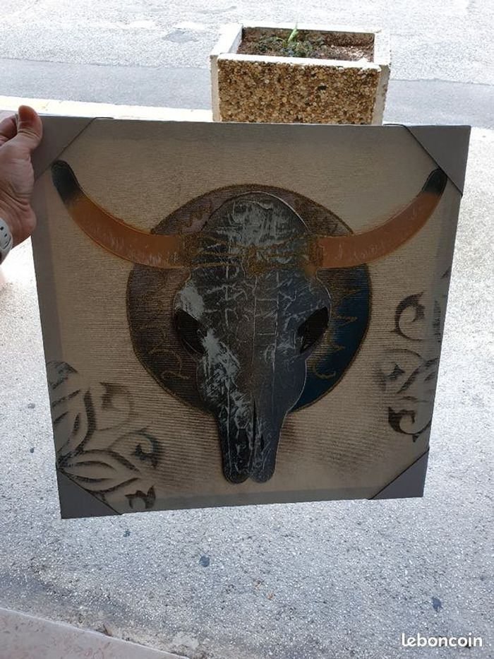 Tableau toile carré gifi crâne taureau peinture argenté beige
