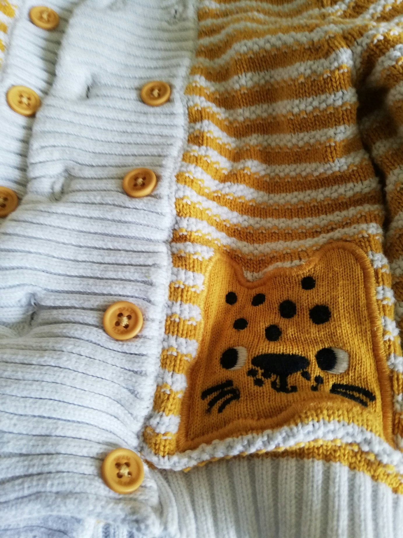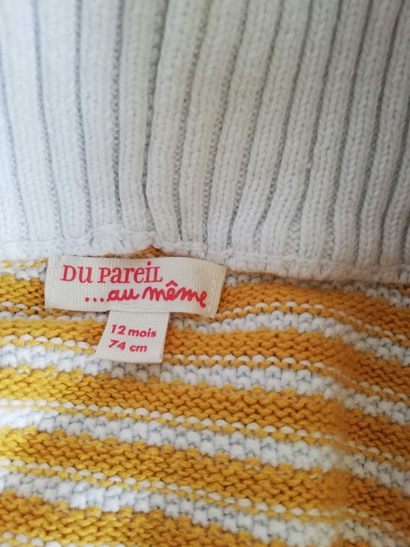 Gilet de chez du pareil au même. De couleur jaune moutarde et blanc avec motif lion au poche. Mis 3fois. Taille 12 mois.