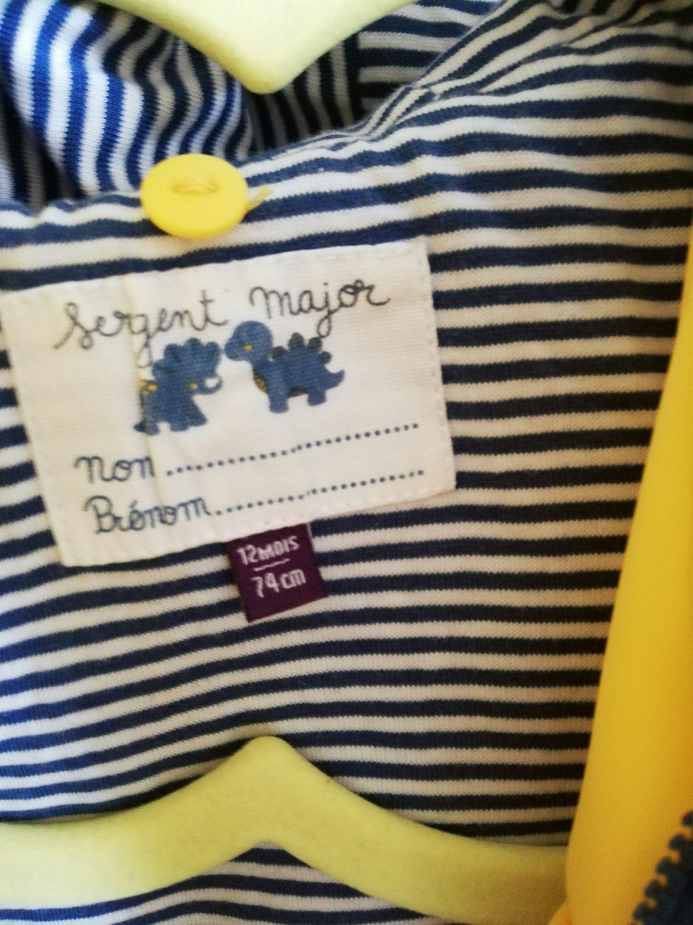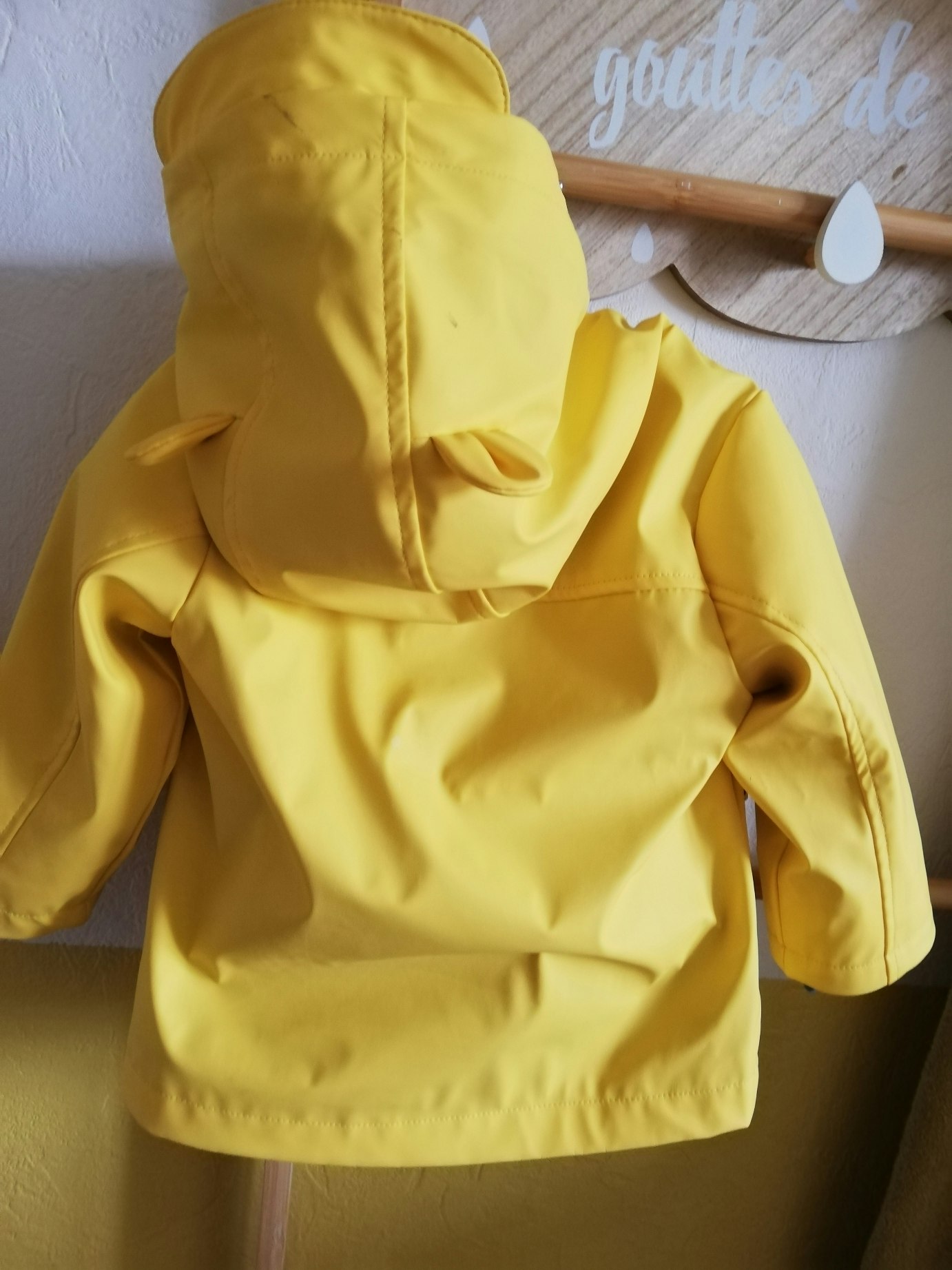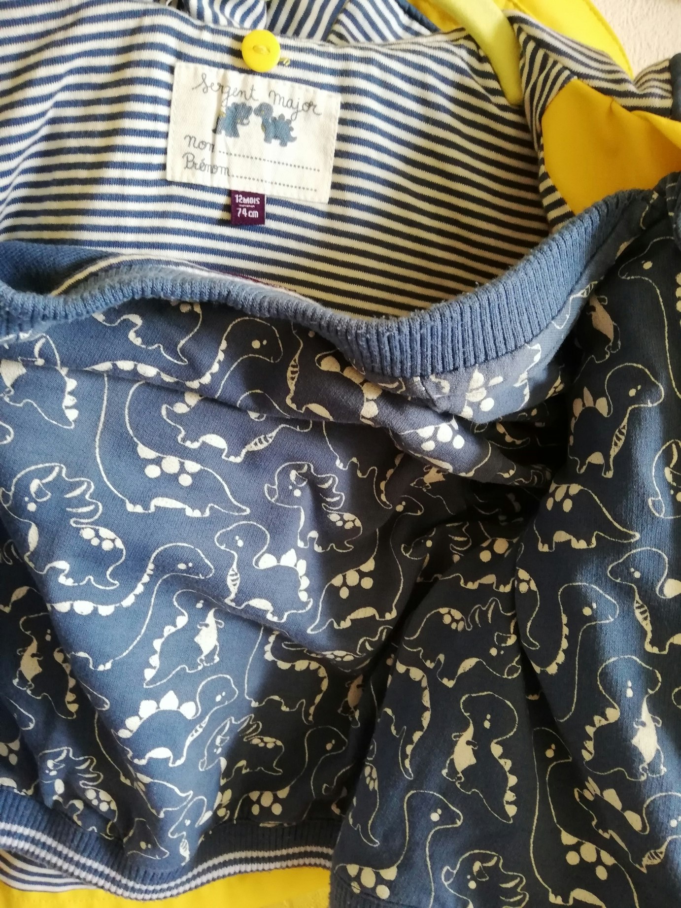 Parka jaune doublé d'une veste à L'intérieur motif dinosaure elle peut s'enlever. De chez sergent major. Acheter en mai au prix de 47euros porter 4 fois. Taille 12mois En très bon état.