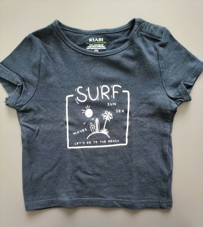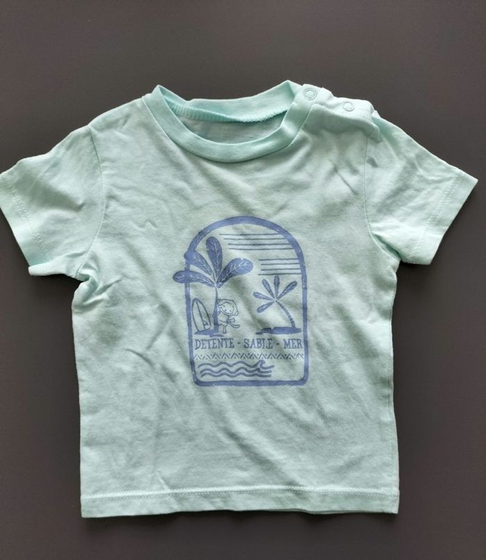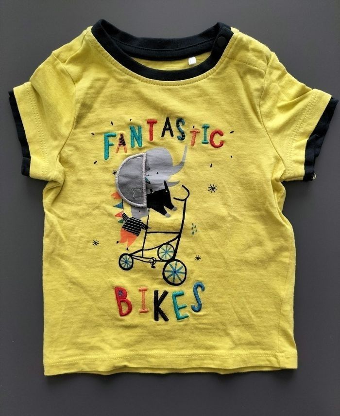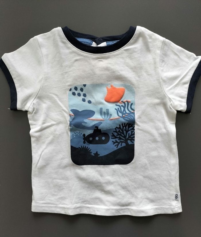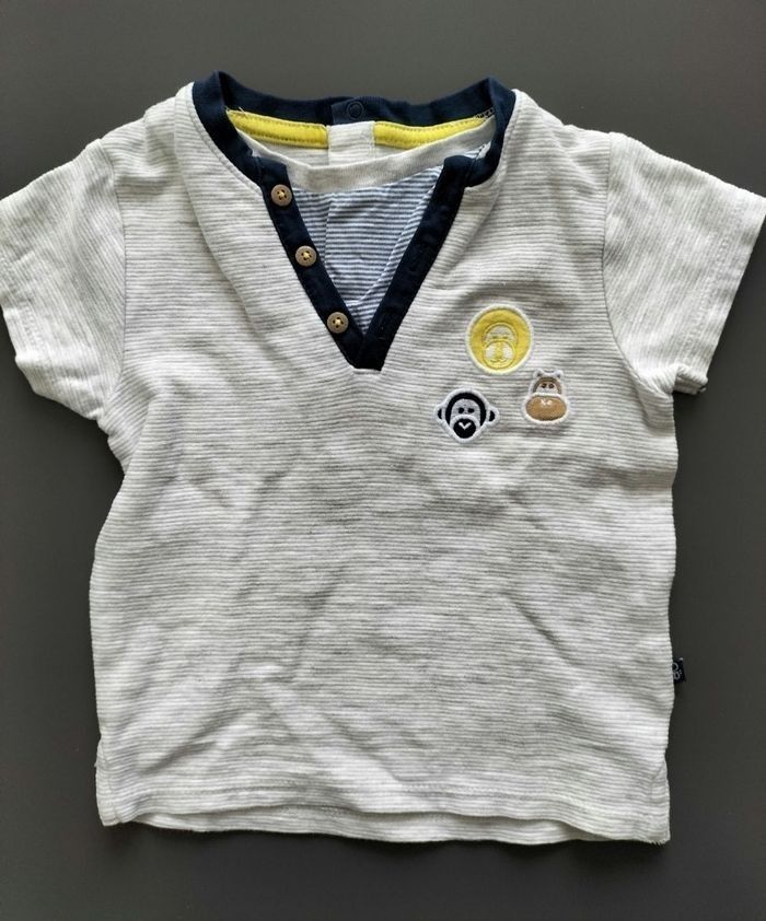 Comprends 7 tee shirt de différentes marques . Blanc avec motif marin et rayé avec faux col , obaibi , très bon état Avec le dinosaure , tape a l'oeil, très bon état Le jaune et saumon , orchestra , très bon état Le bleu marine , Kiabi, bon état Le bleu ciel kimbaloo , bon état