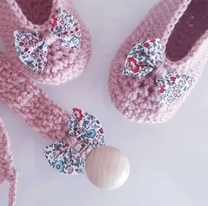 Coffret naissance/set d'accessoires bébé attache tétine et chaussons ballerines bébé tricot noeud liberty fille naissance Ce coffret contient : - une jolie paire de chaussures/ballerines, -une attache tétine avec une pince en bois non traité. L'ensemble bébé naissance est entièrement fait à la main au crochet avec du fil de coton bio doux et agréable au toucher, idéal pour la saison estivale printemps été. Les ballerines et l'attache tétine sont décorés d'un petit noeud en tissu fleuri liberty vintage. Modèle unique ! Envoi rapide et soigné dans du papier de soie délicat. Entretien facile : - lavage en machine programme coton (30°c) - essorage doux (400 tr/min) - pas de sèche linge ni repassage