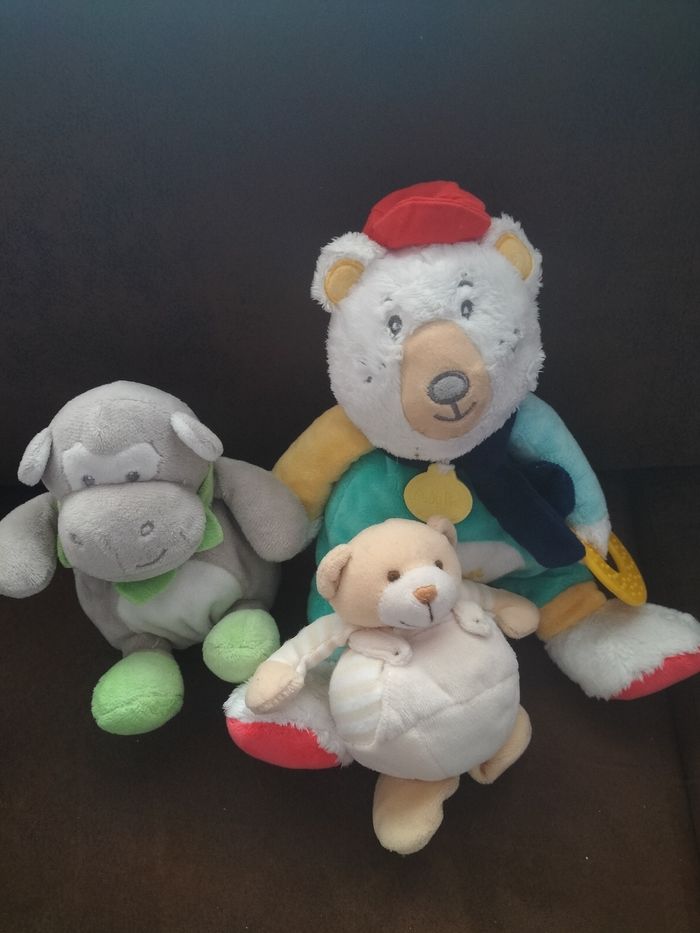 Lot de 3 doudous Très bon état Le grand doudou ours fait hochet et anneau Marque baby nat Le lot 5€