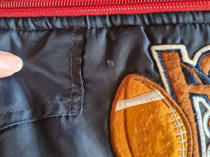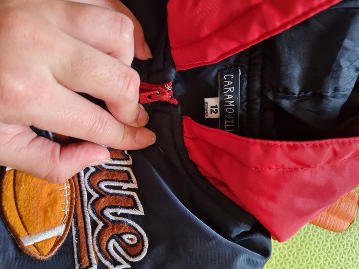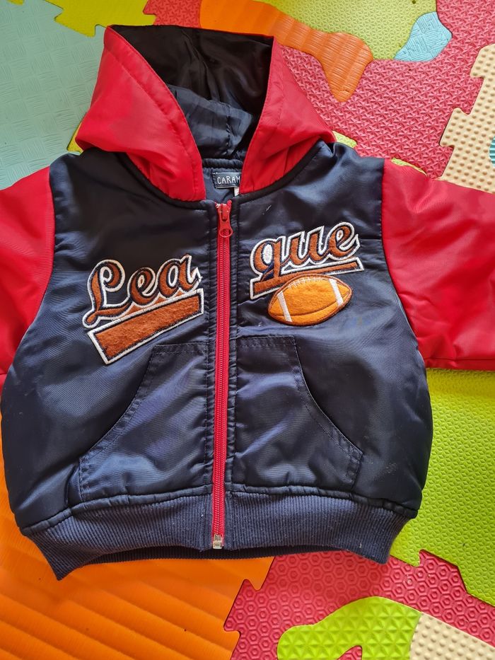 Blouson mi-saison avec capuche bi-couleur Léger tâche sue le devant du blouson Fermeture fonctionnelle Pas se trou ni déchirure Taille 12 mois