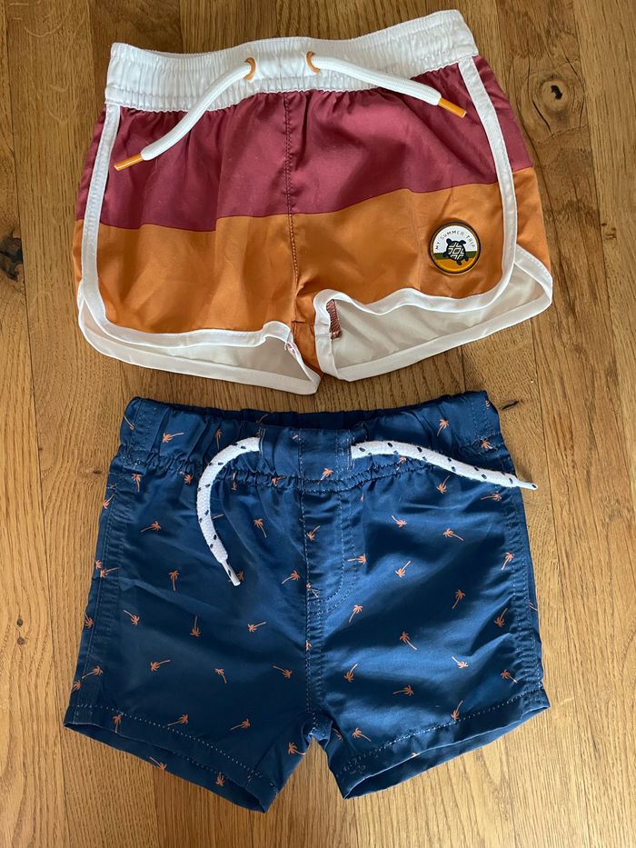 Vends lot de 2 shorts de bain Très bon état Le rayé est mentionné en 12 mois mais taille extrêmement petit Le bleu est en 6 mois et taille juste