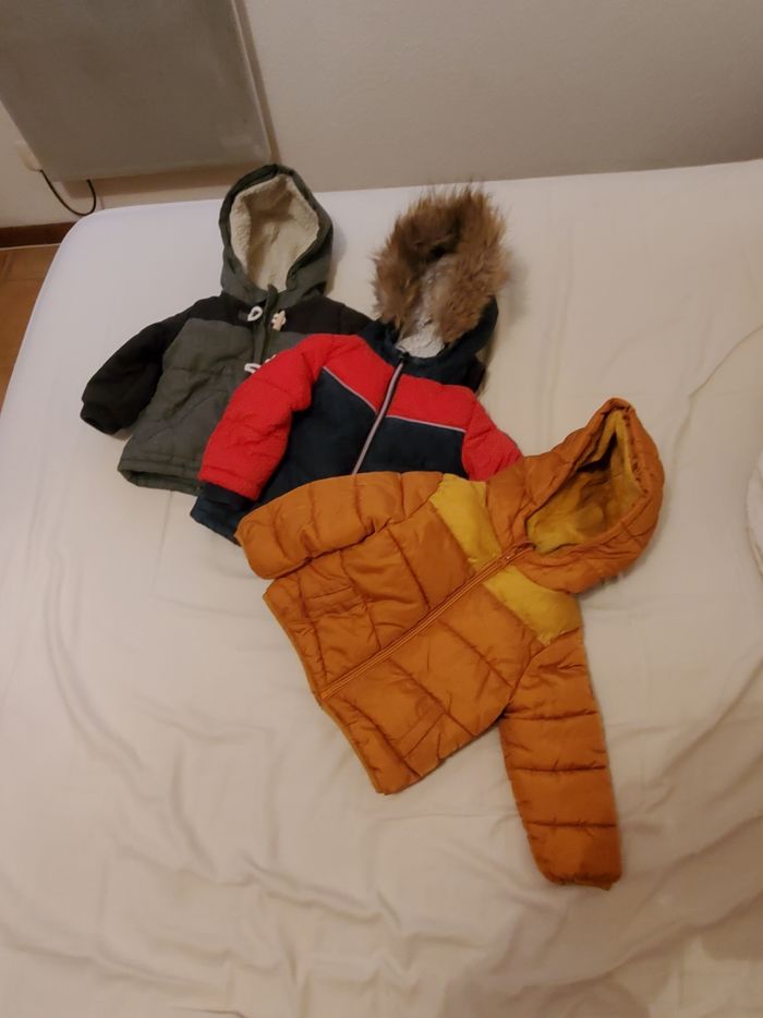 Vends 3 manteaux hiver bien chaud taille 18 mois de marque: - tape à l'œil pour le manteau rouge et bleu 18mois/80cm - kiabi pour le jaune 18mois 77/82cm - kiabi pour le noir et gris 18mois 77/82cm Les 3 manteaux sont en très bon état. Pas de taches pas de trous La taille du colis sera en.fonction du nombre de manteau acheté 7 euros le manteau au choix 17 euros les 3 manteaux