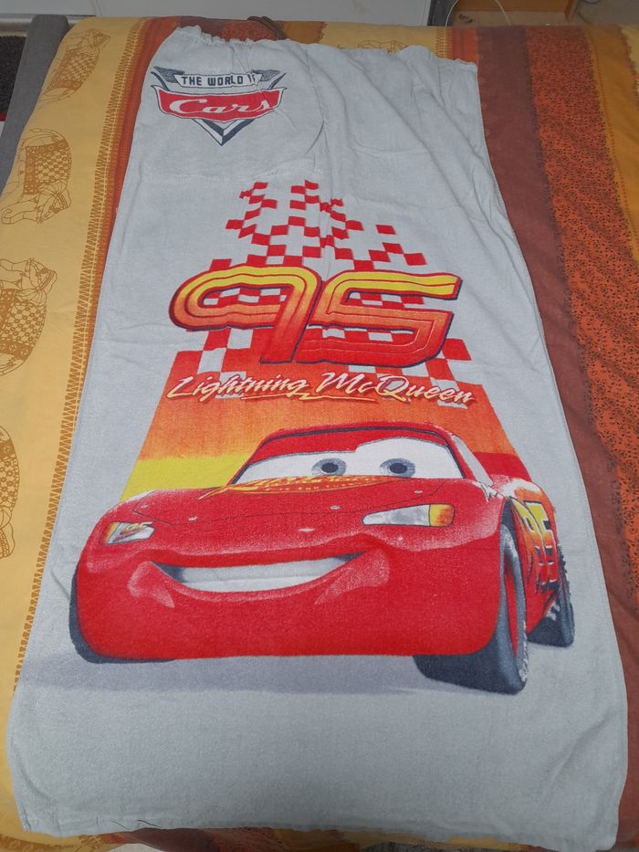 Serviette de bain enfant avec sa poche idéal pour le transport. En bon état justeune petite marque d'usure au niveau de la poche voir photo.