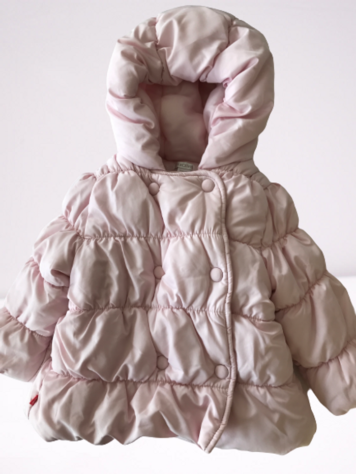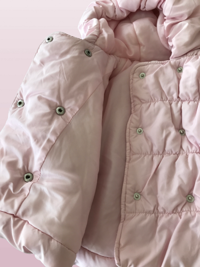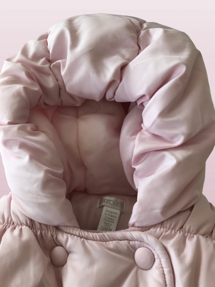 Doudoune à capuche Fermeture par double rangée de boutons pressions Composition : Polyester: 100% Doublure : 100% polyamide Couleur : Rode clair Très bon état, presque neuve Taille : 12 Mois Marque : OBAIBI