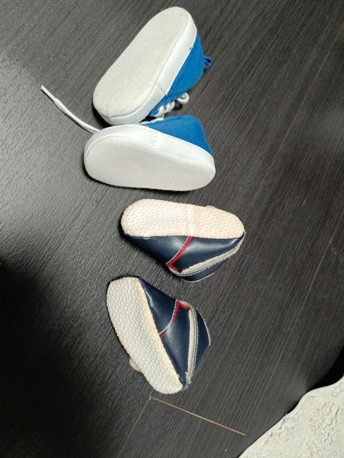 Une paire de petites chaussures et une paire de baskets 0-6 mois très bon état Couleur bleu