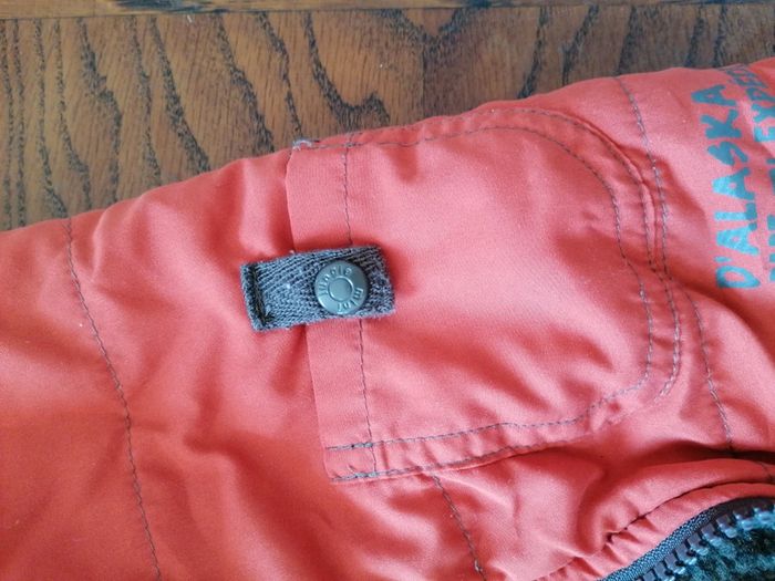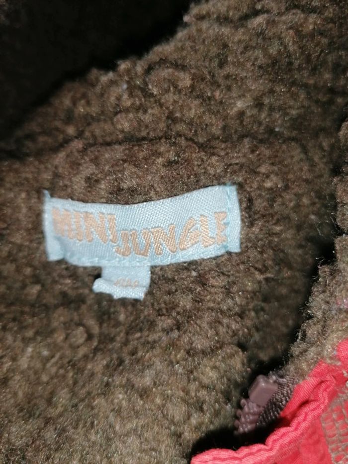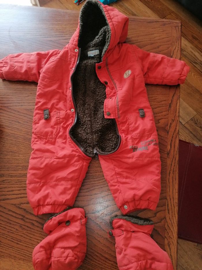 Combinaison couleur brique mixte Avec chaussons amovibles Intérieur polaire Capuche fixe Deux petites poches fermées par bouton pression Fermeture éclair et boutons Taille 6 mois
