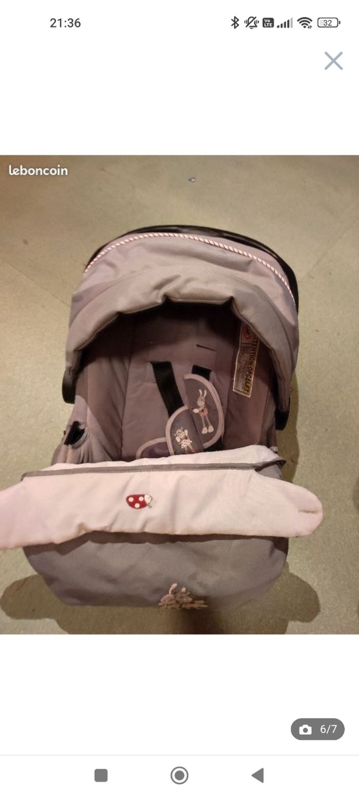Poussette noukies trio Paquito et Lolita Cosy, nacelle et assise Réducteur pour cosy et assise Le guidon est réglable en hauteur Les roues peuvent être démonter Tout en très bon état sauf l'assise qui est un peu décousu voir avant dernière photos mais n'empêche en rien sont utilisation N'hésitez pas à me contacter pour plus d'informations possibilité de la voir sur place