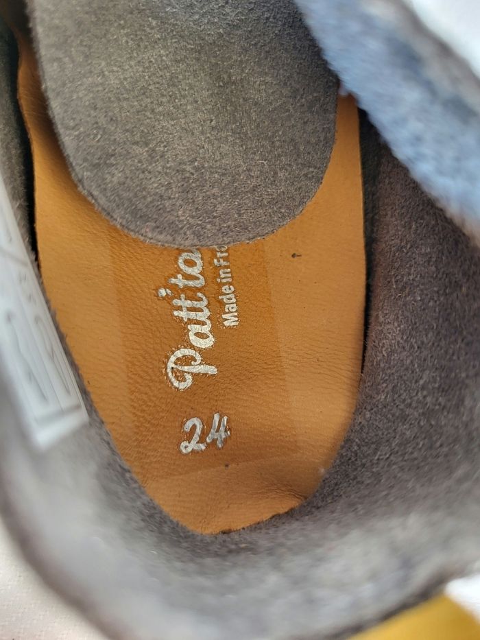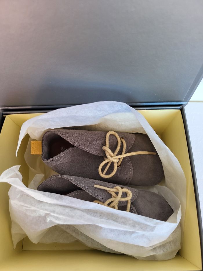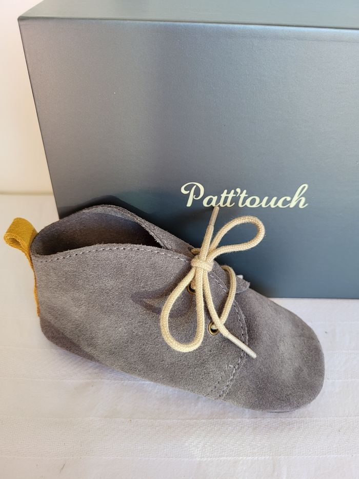 Chaussures bébés de très belle qualité, tout en croûte velours très souple grise, non doublé, semelle intérieure en cuir beige, de la marque PATT'TOUCH, entièrement dessinées et fabriquées en France
