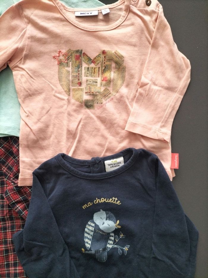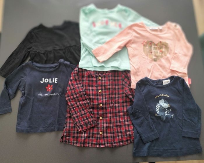 Lot composé de 6 hauts manches longues Le noir Kiabi, porté mais encore en bon état Le bleu marine avec la fleur mes petits cailloux , porté mais reste en bon état . Le bleu ciel , orchestra, porté mais aucune marque d'usure . Le saumon , marque Mexx ( taille 3-6 mois , mais je le mettais a ma fille en même temps que le 6 mois ) , très bon état La chemise a carreaux h&m , (taille 6-9 mois , pareil que je mettais a ma fille en 6 mois ) , très bon état . Le bleu marine avec la chouette tape a l'oeil . Le lot ne présente ni trou, ni tâche .