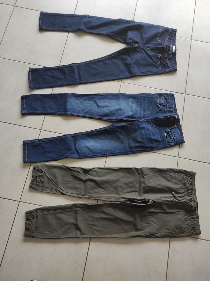Lot de 3 pantalons les 3 sont neufs jamais mis Un jean skinny Kiabi 12 ans élastique taille intérieure Un jean tex 11-12 ans tex élastique taille intérieure Un pantalon 11-12 ans tex vert kaki élastique et cordon taille