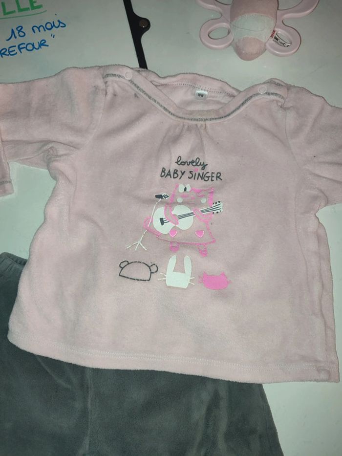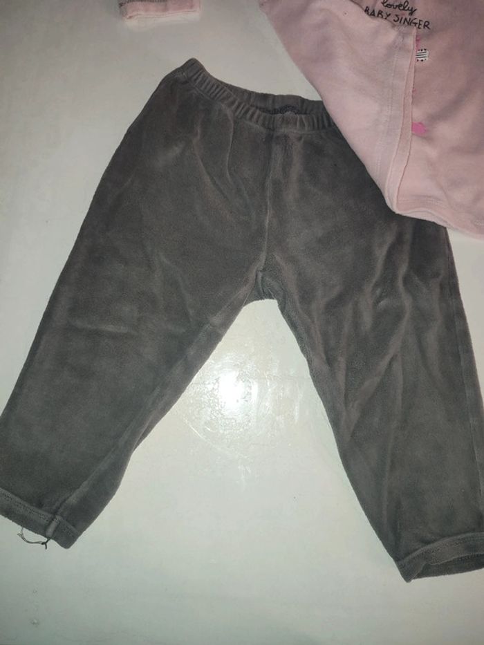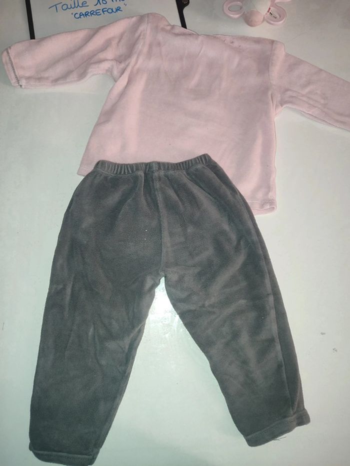 Pyjama velours deux pièces, haut rose clair avec motif et fermeture pression sur l'épaule et pantalon grise foncé. Très bon état. Marque Carrefour Taille 18 mois #celine76590fille18mois