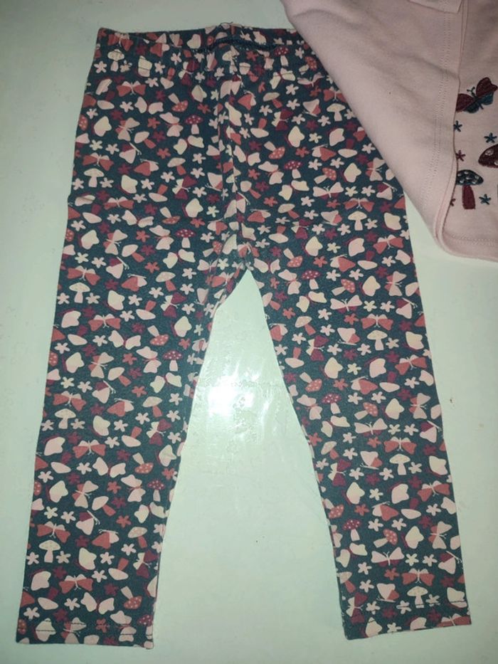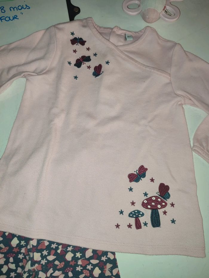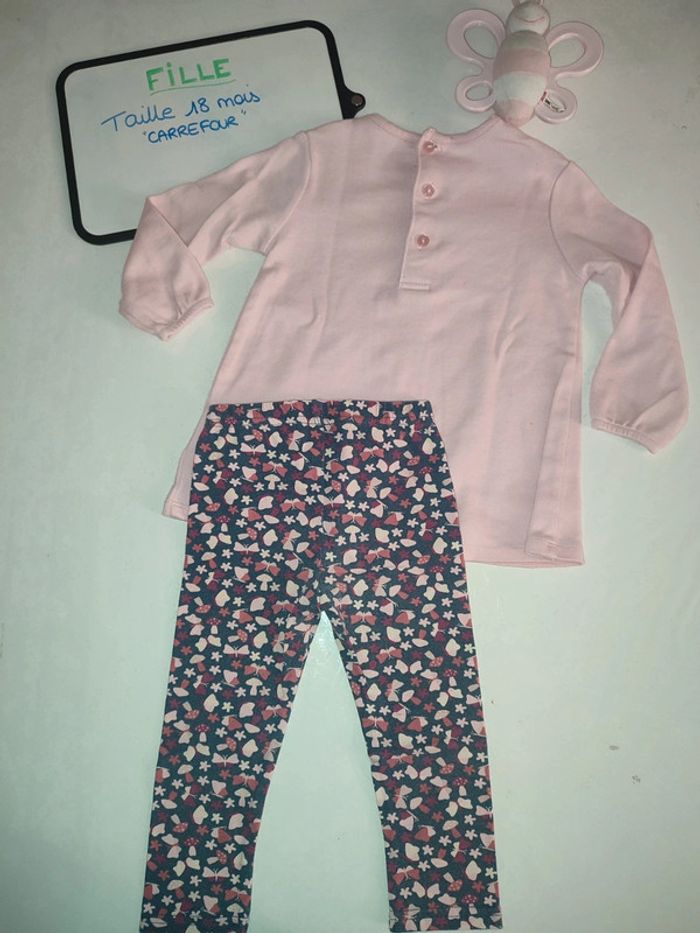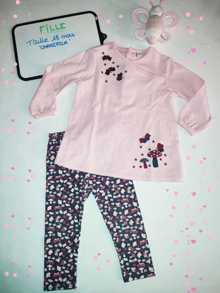 Ensemble comprenant tunique manches longues rose avec motif et boutons dans le dos + legging bleu marine avec motifs. Très bon état. Marque Carrefour Taille 18 mois #celine76590fille18mois