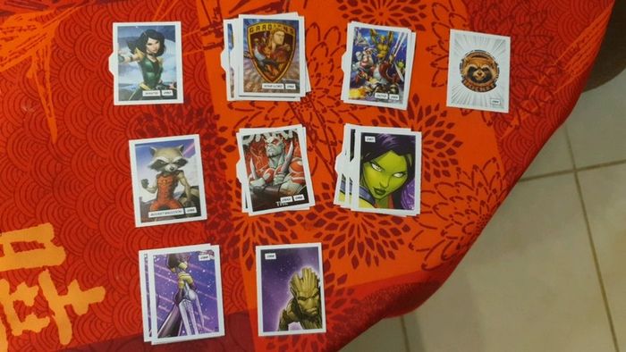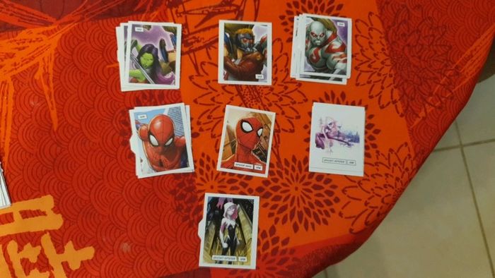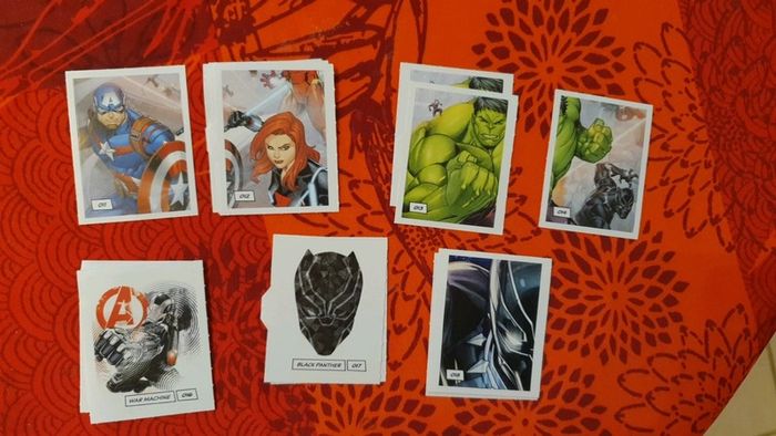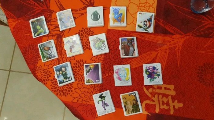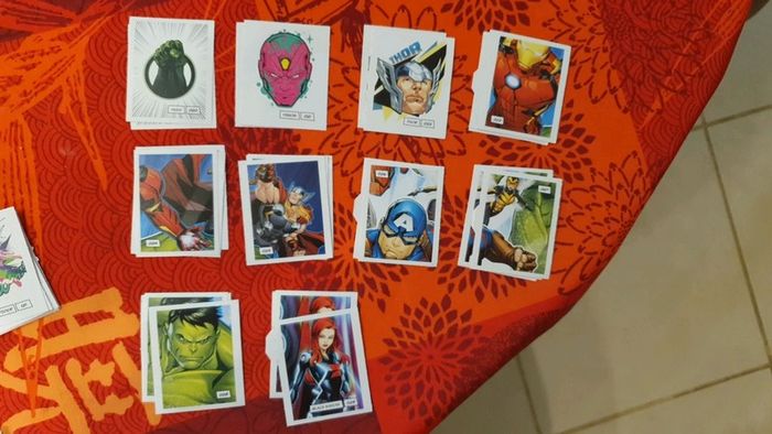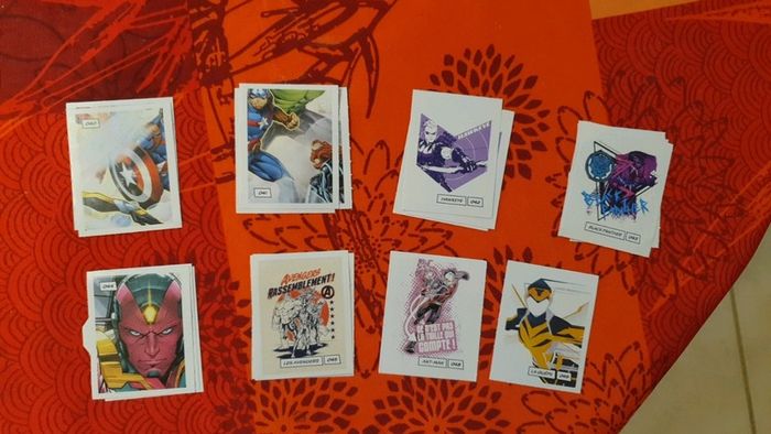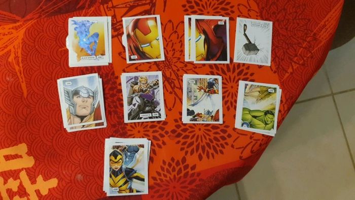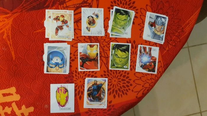Lot de 343 étiquettes Marvel Devient un héros. Il y a de nombreuses cartes en doubles, mais on n'est pas loin de pouvoir refaire un album complet! Vendue 0,25€ l'étiquette. Bien entendu le lot est dissociable, demandez les étiquettes que vous recherchez et je pourrais créer un nouveau lot avec celles que vous souhaitez. Il y a de très nombreuses cartes, nombreux doubles, au vue de la quantité (353) je ne peux pas toutes les lister. Les frais de ports sont également ajustable, envoi possible également en lettre simple (timbre vert) ou lettre suivie, ....