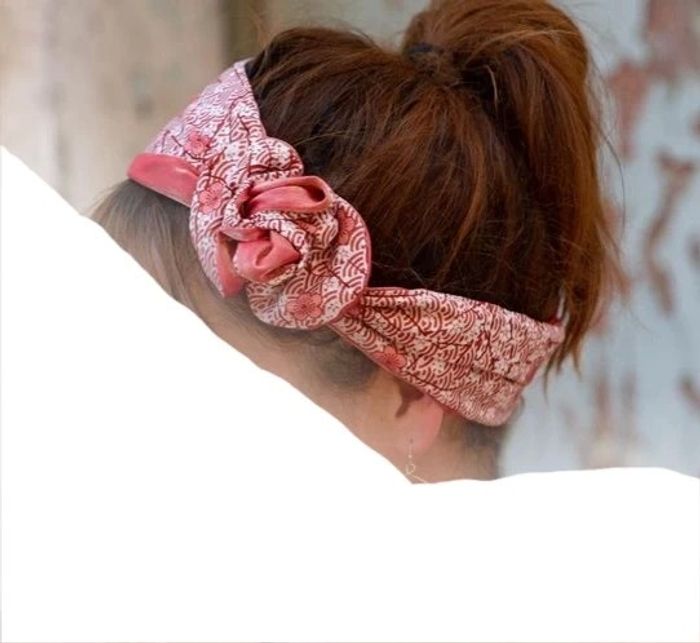 Bandeau cheveux femme articulé avec un fil de fer. Matière : coton/polyester Style et couleur : coton aux motifs japonisants arrondis Fabrication Française NEUF, juste essayé mais ne me convient pas Bandeau court réversible : 7/8cm x 85cm - un tour de tête Confort inégalable grâce au fil de fer qui épouse la forme de la tête sans serrer Fil de fer bloqué dans une goulotte tout autour de la bande de tissu Réversible Ne gêne en rien les appareils auditifs Entretien : Lavable à la main à l'eau froide – le fil de fer est protégé donc il ne rouille pas, ne casse pas. Ne pas passer au sèche-linge!