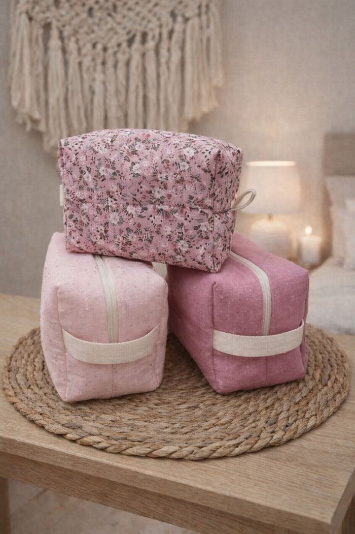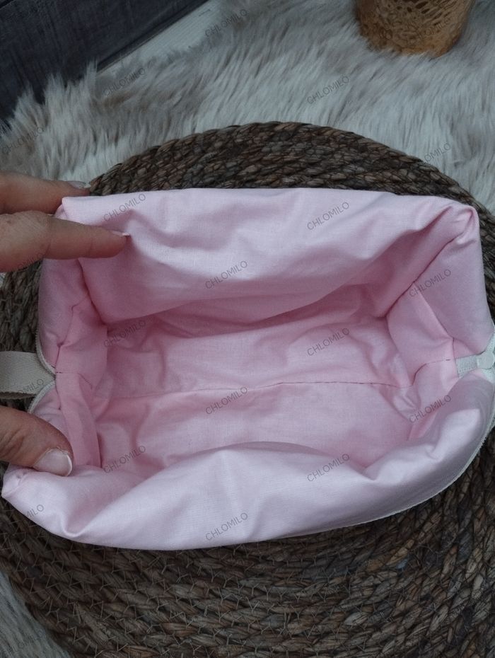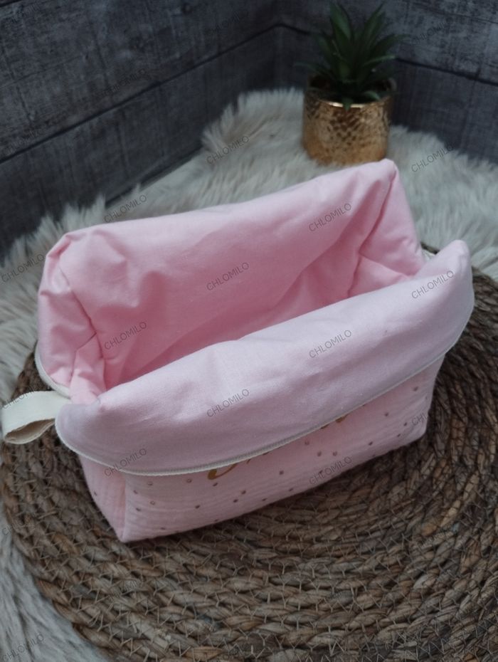 Trousse de toilette: Dimensions idéales pour mettre les couches et le nécessaire de toilette de bébé Vous pouvez aussi l'utiliser en trousse à maquillage ou trousse de voyage. L'extérieur est en double gaze de coton molletonné, l'intérieur est en coton enduit imperméable. Dimensions L19xH12xP10 Différents coloris possibles Possible également de floquer un prénom sur la trousse (+2€)