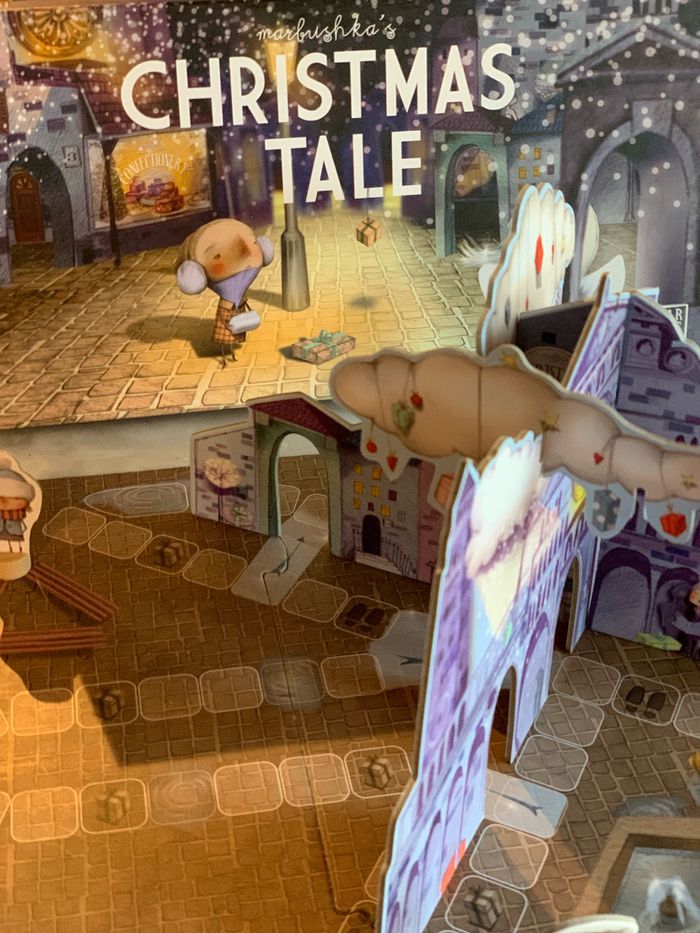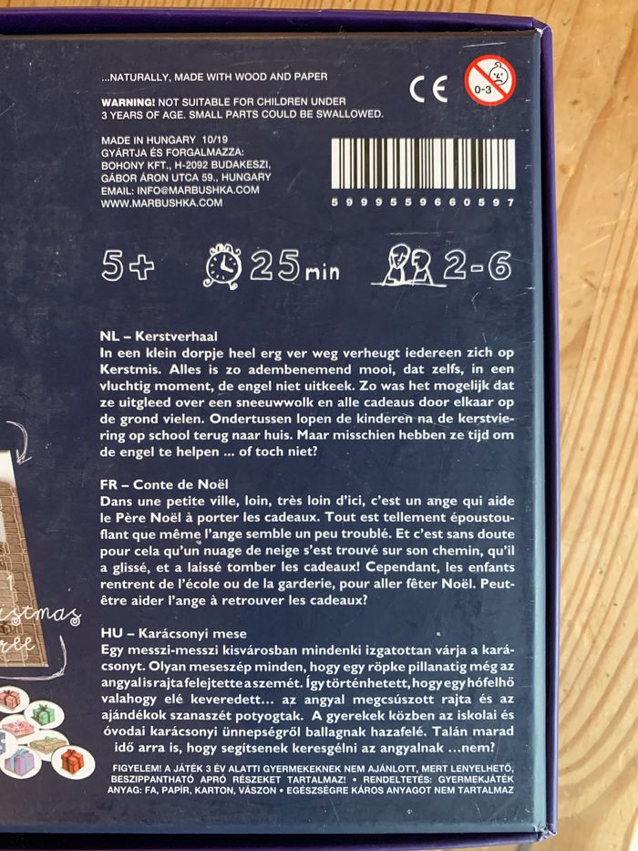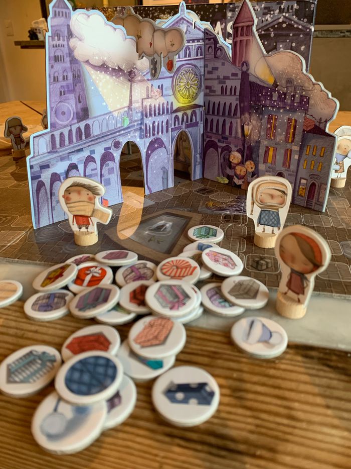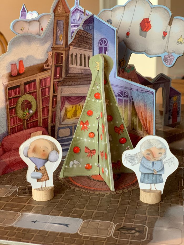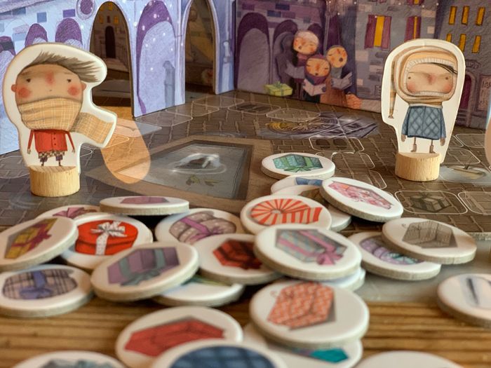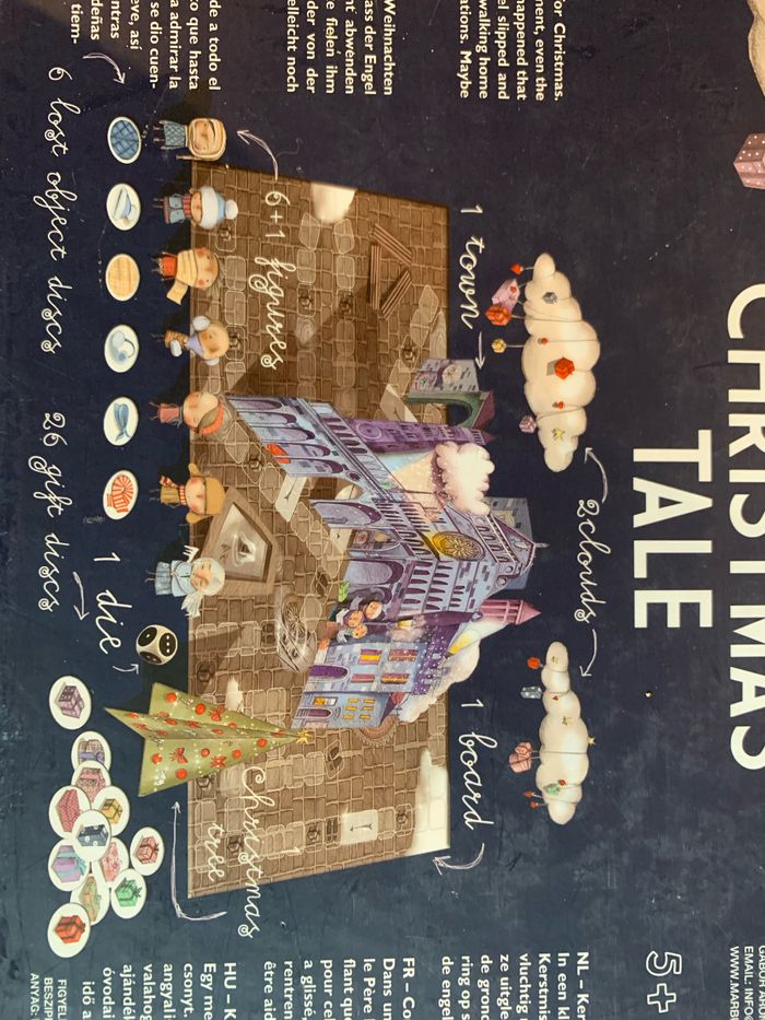 À partir de 5 ans . Coopératif et compétitif Jeu de société spéciale fête de Noël. Dans une petite ville très éloignée, tout le monde est excité pour Noel. Il y a des lumières de fêtes à toutes les fenêtres, les maisons sont toutes décorées. Tout est si beau, que même l’ange a été ébloui. Et a glissé et a mélangé tous les cadeaux au pied du sapin. Pendant ce temps, les enfants rentrent de la fête de Noel. Et il faut s’arrêter tant de fois, regarder les vitrines, discuter, ramasser des chapeaux perdus... mais peut-être qu’ils ont le temps d’aider l’ange, aussi ... non? Bien que le jeu est compétitif (le premier a gagné), il a un caractère coopératif parce que surtout à la fin, vous faites de votre mieux pour chaque copains et copines reçoivent ses cadeaux afin que vous puissiez célébrer Noel ensemble!