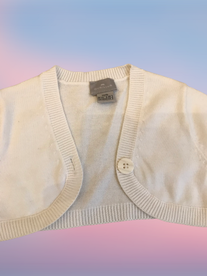 Joli gilet qui convient très bien pour une cérémonie Devant arroci fermé par un bouton Matière : 100 % coton Très bon état Taille : 24 Mois Marque : CYRILLUS