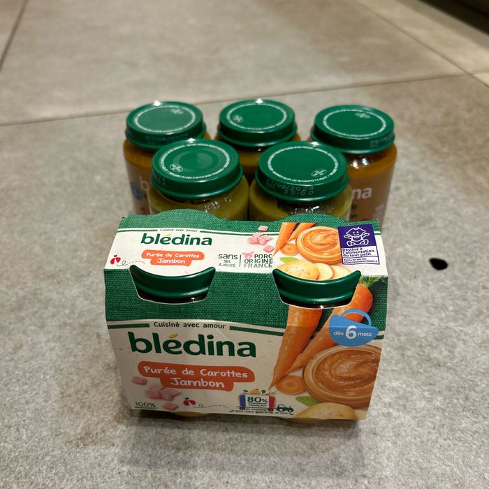 Lot de pots pour bébé à partir de 6 mois. - 3 Purée de carotte jambon - 2 Légumes verts poulet - 1 Ratatouille riz poisson - 1 Jardinière de légumes bœuf