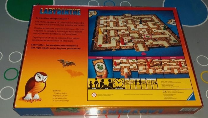 Jeu Labyrinthe Ravensburger Complet Vous pénétrez dans un labyrinthe enchanté à la recherche de fabuleux trésors. Poussez astucieusement les couloirs, déplacer votre pion et tentez d'atteindre ces trésors tant convoités. Mais attention, les couloirs du labyrinthe bougent tout le temps ! Le joueur qui aura trouvé tous ses trésors et ramené son pion à son point de départ sera déclaré vainqueur.  Très bon état