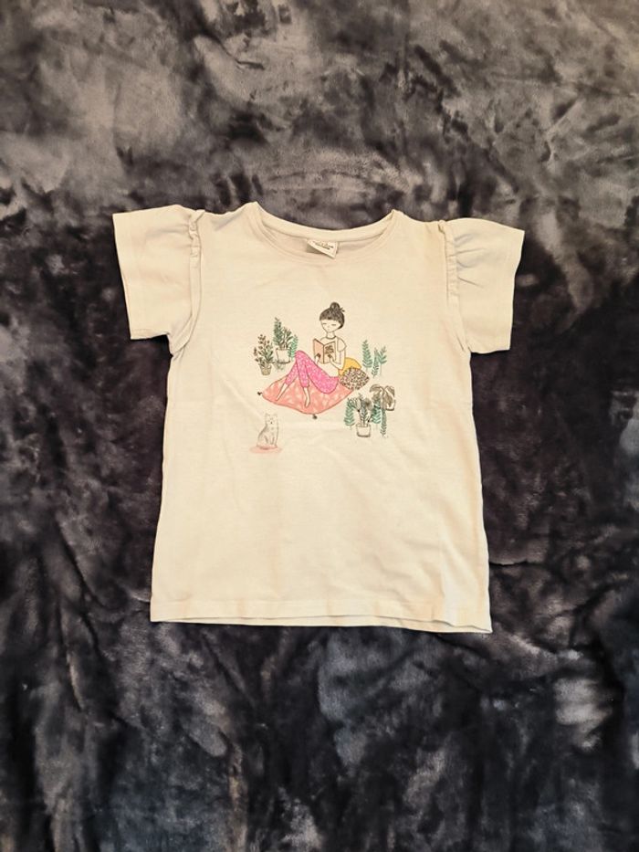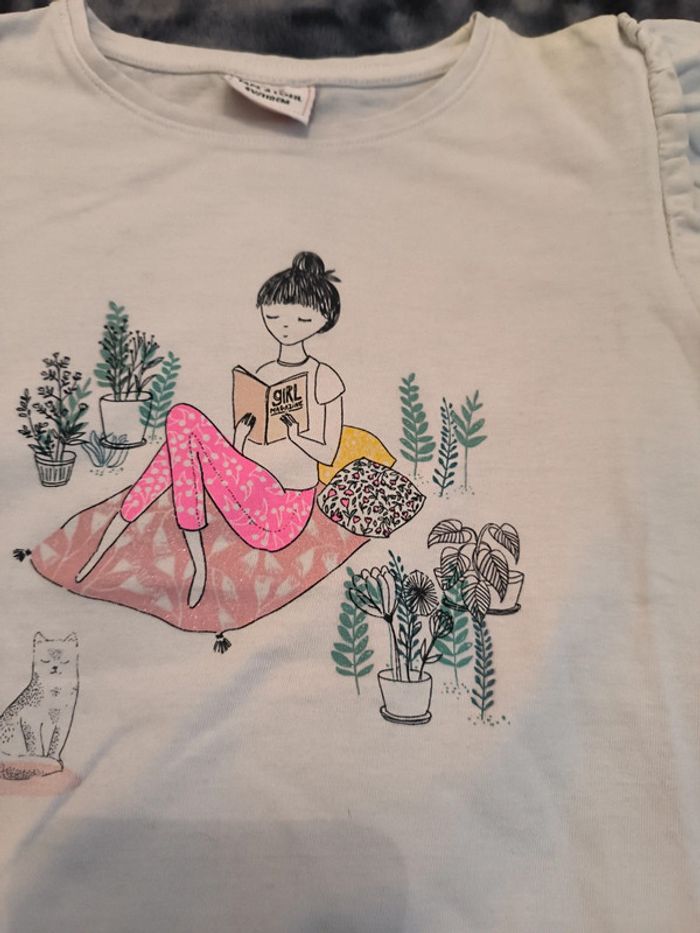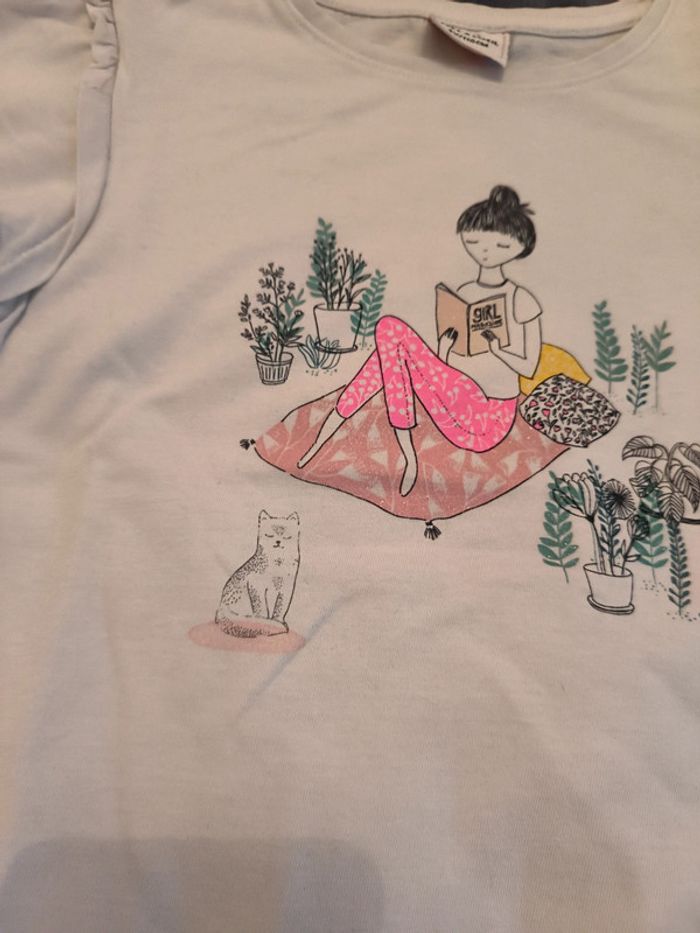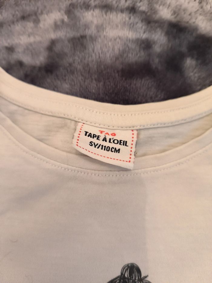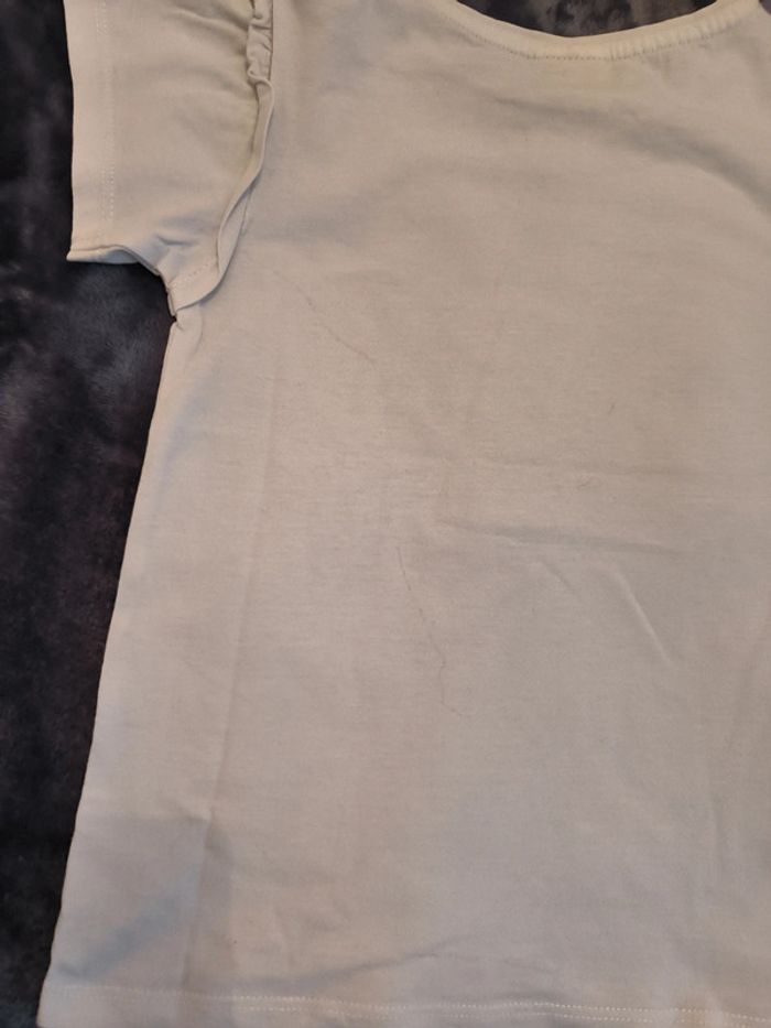 À donner pour tout autre achat, tâcher à l'arrière (voir photo) Manches courtes avec froufrou Logo avec paillettes sans défaut Énormément de 5 ans à publier Réductions activés