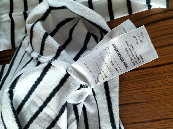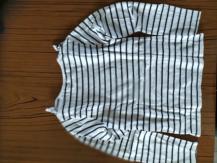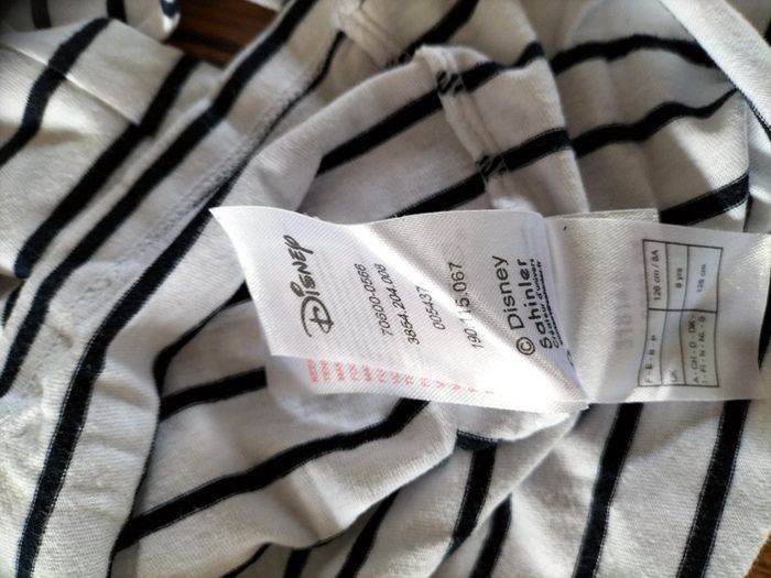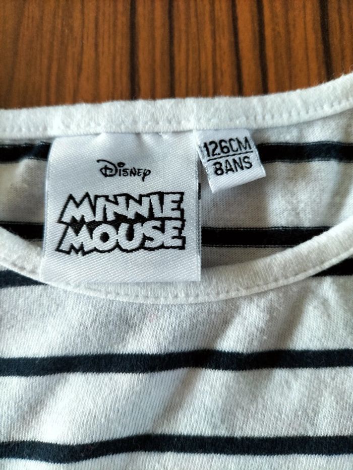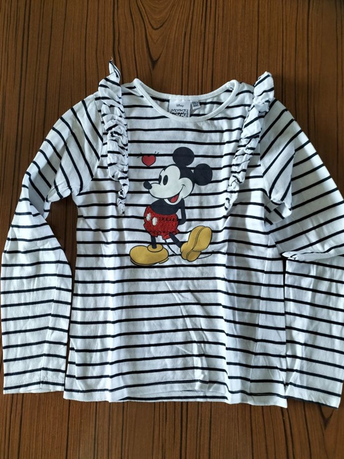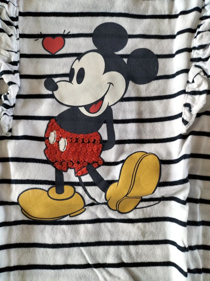 Tee-shirt manches longues blanc a rayures bleu marine avec Mickey sur le devant avec des sequins rouge de la marque Disney et Vertbaudet en 8 ans neuf sans étiquette.