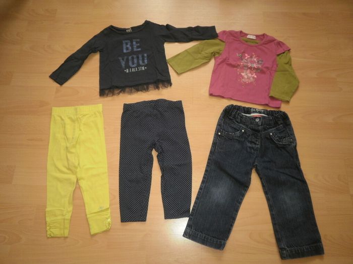 Bonjour, Je vends ce lot de vêtements pour Fille en taille 2 ans (ou 24 mois) composé de (de haut en bas sur la photo) : - 1 T-shirt à ML "Tape à l'Oeil" - 1 T-shirt à ML "Sucre d'Orge" - 1 legging jaune "Orchestra" (3 ans mais taile plus petit) - 1 legging bleu foncé à pois blanc "Disney" - 1 pantalon en jeans "Tissaïa" avec lien de serrage à la taille.