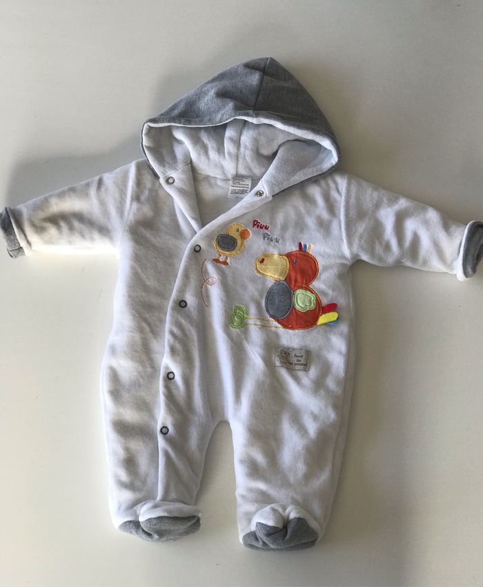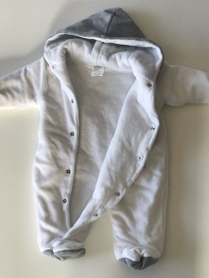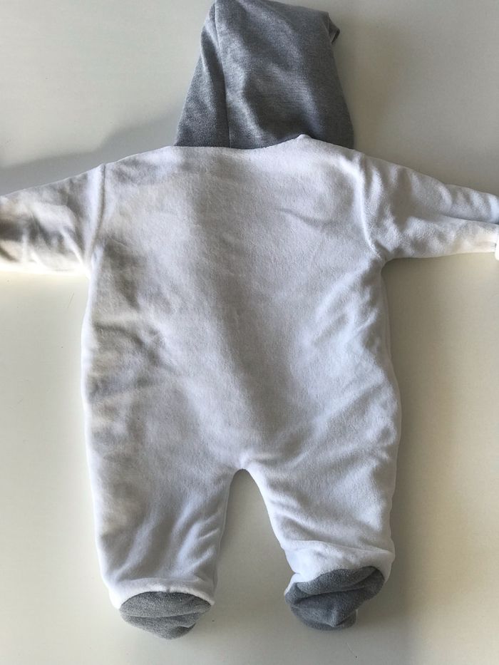 Combinaison blanche au toucher doux, taille naissance à 3 mois. 80% coton + 20% polyester. Intérieur 100% coton et garnissage 100% polyester. Ouverture par pression devant.