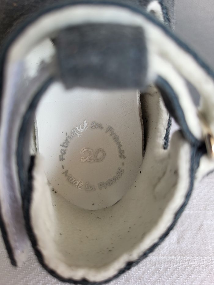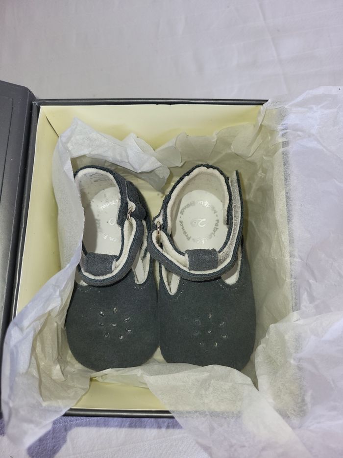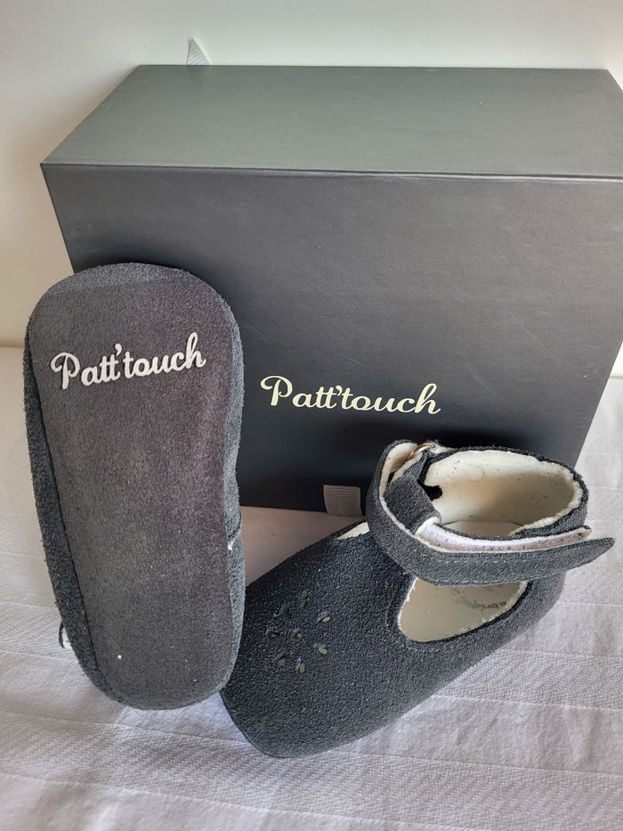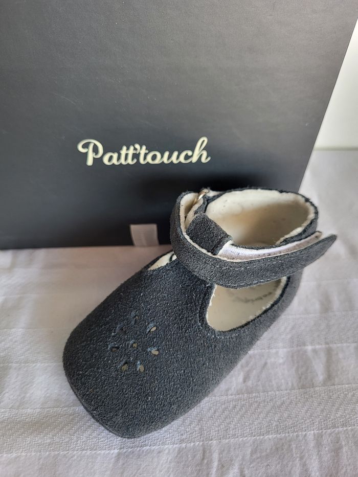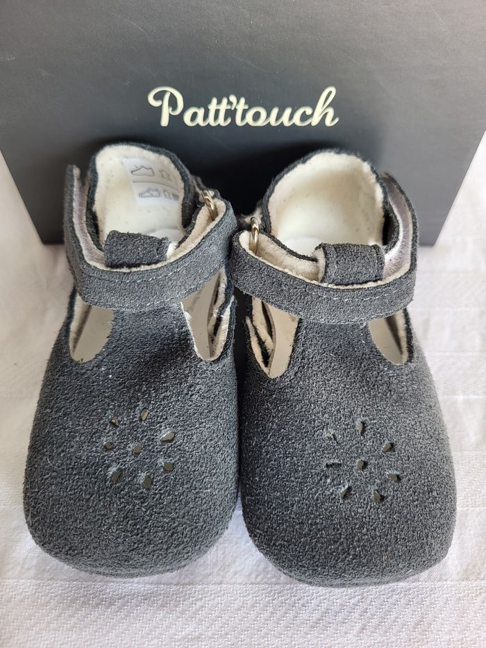 Chaussures pour bébés couchés de très belle qualité, tout en croûte velours souple grise, doublure hiver, semelle intérieure en cuir blanc, de la marque PATT'TOUCH, entièrement dessinées et fabriquées dans un atelier familial près de Bordeaux