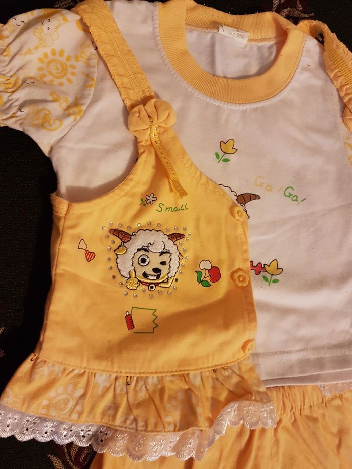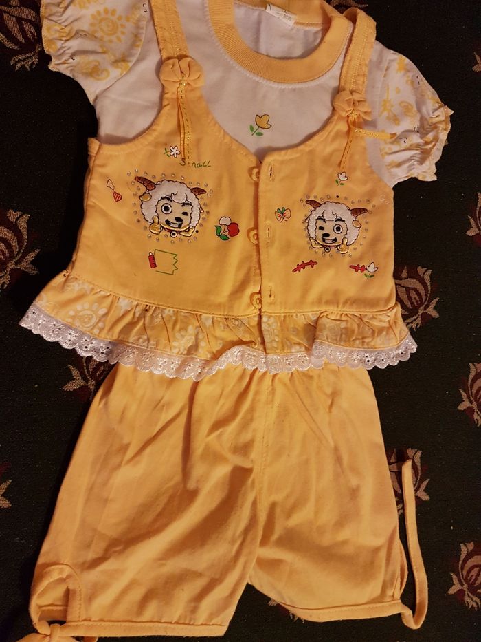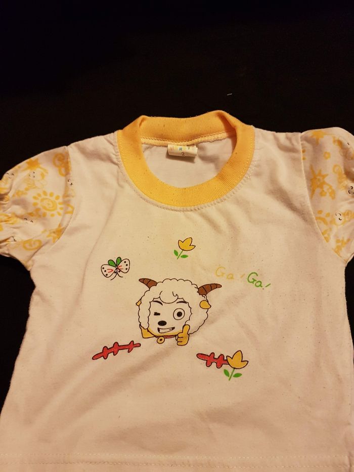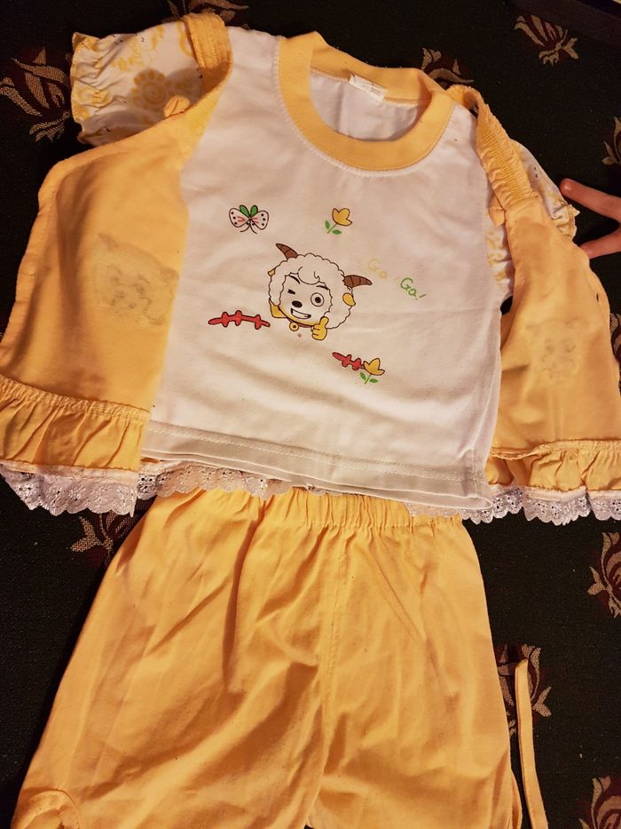 Pyjama pour enfant 24 mois, en bon état, couleur jaune et blanc, 3 pièces T-shirt, short et gilet.