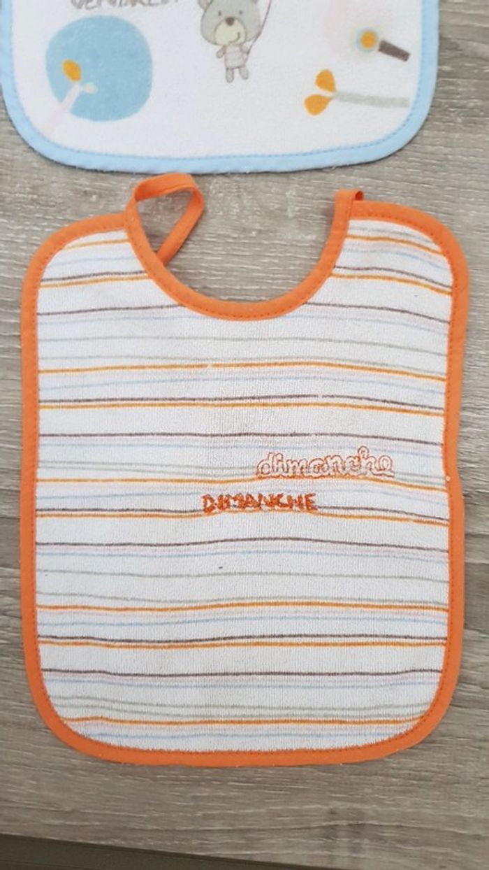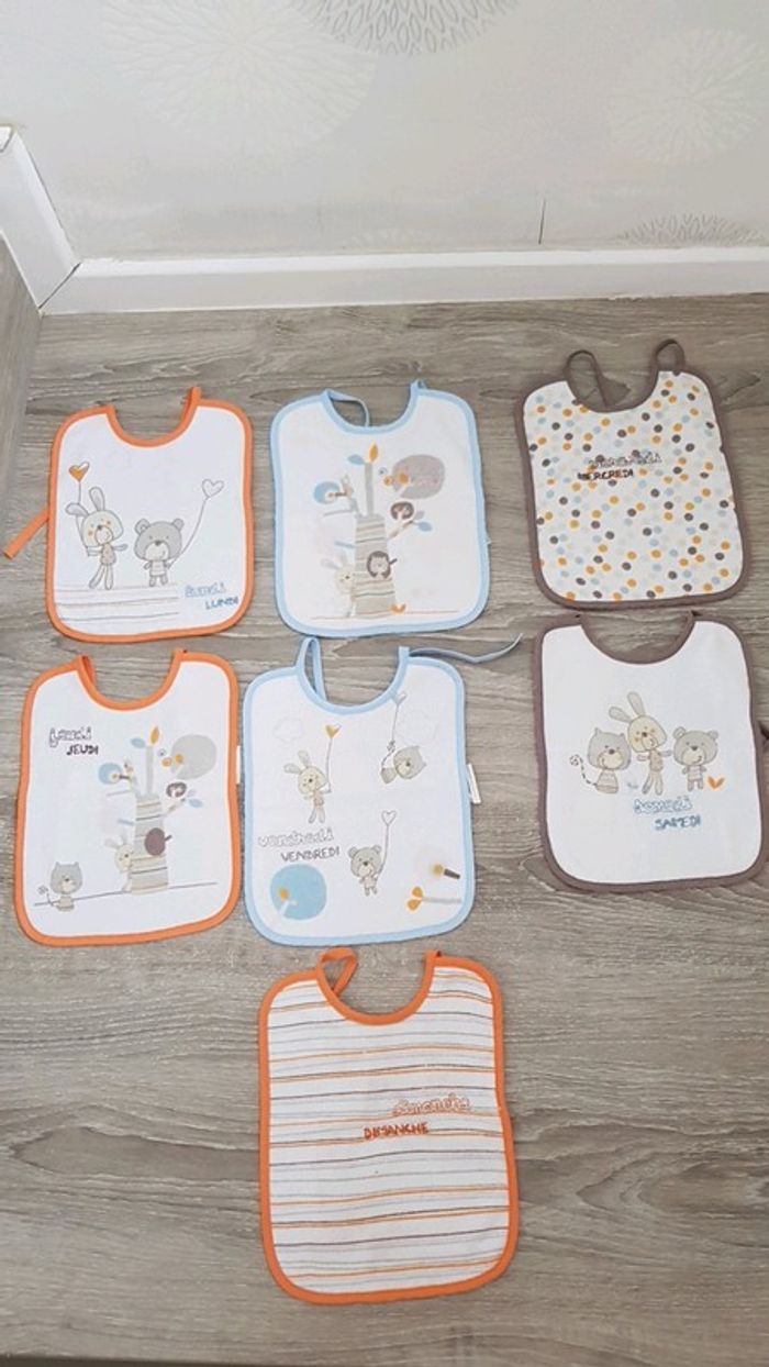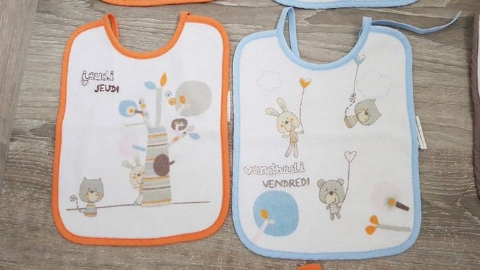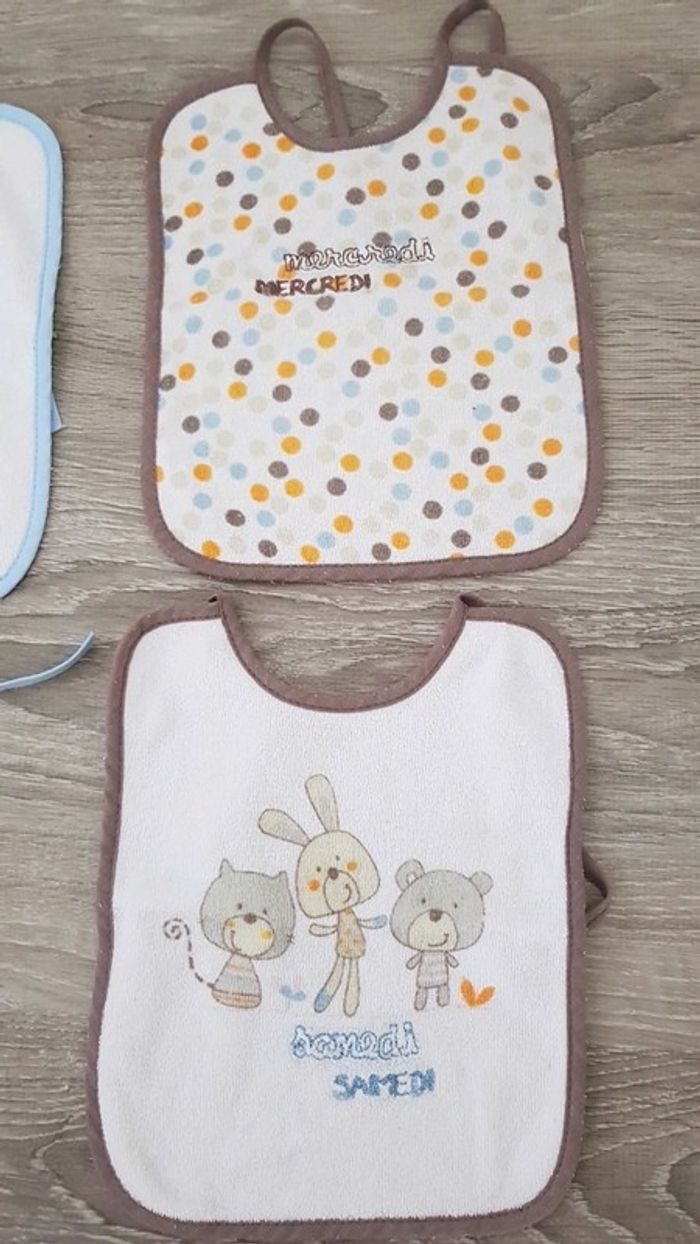 Lot de 7 bavoirs Dessins et jour de la semaine Ils se nouent autour de la tête avec un lien 24 cm de haut/19 cm de large Très bon état Marque Bébé 9