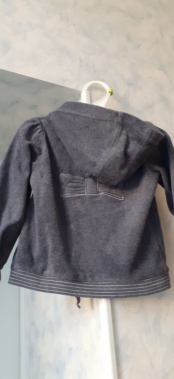 Vends un gilet zippé à capuche aspect velours 77% coton 23% polyester couleur gris foncé avec petites rayures argentées à la base et aux poignets marque DPAM taille 4 ans (104cm)