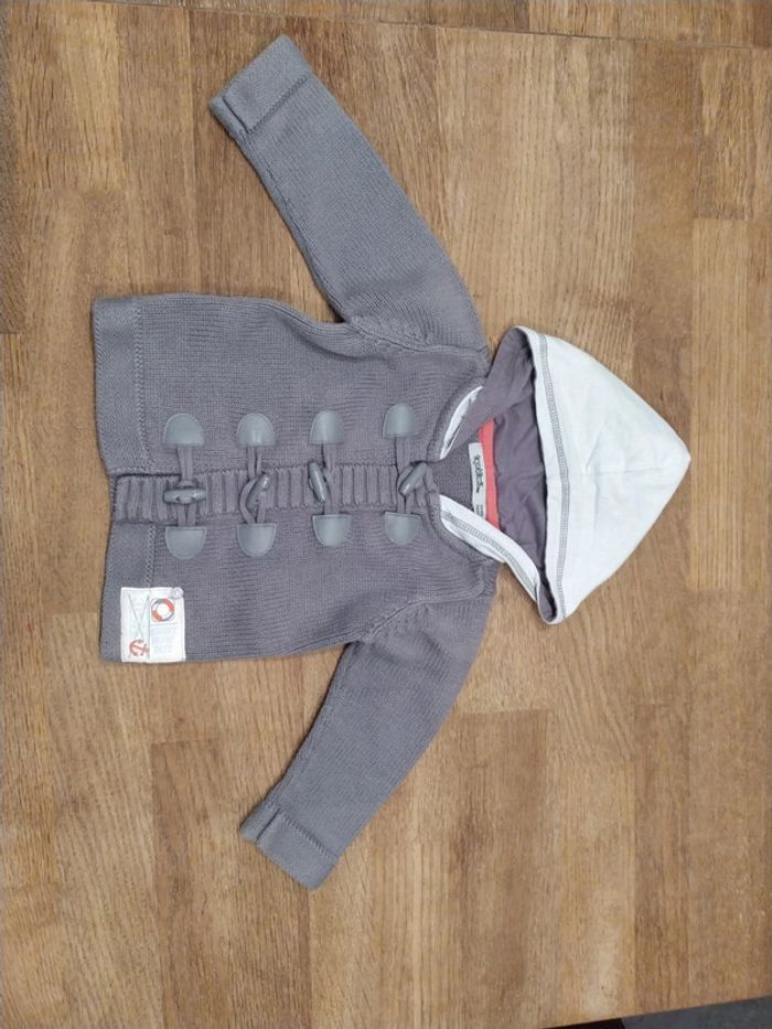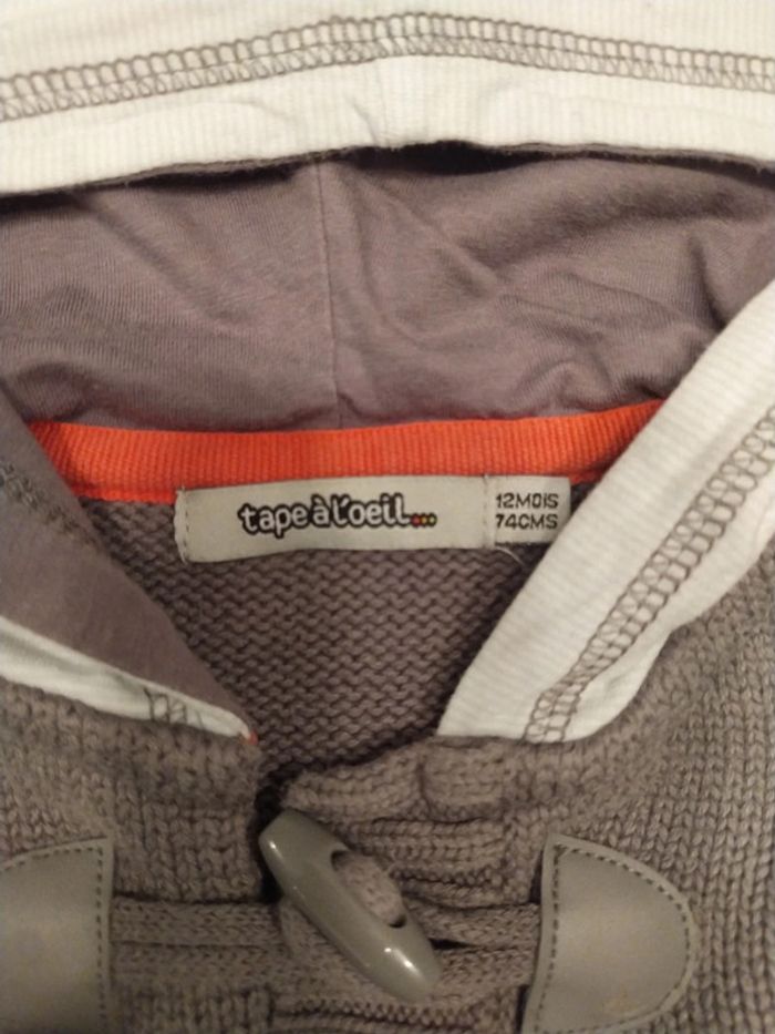 Gilet gris à capuche tape à l'oeil en excellent état. 100% coton. Taille 12 mois, 74cm.