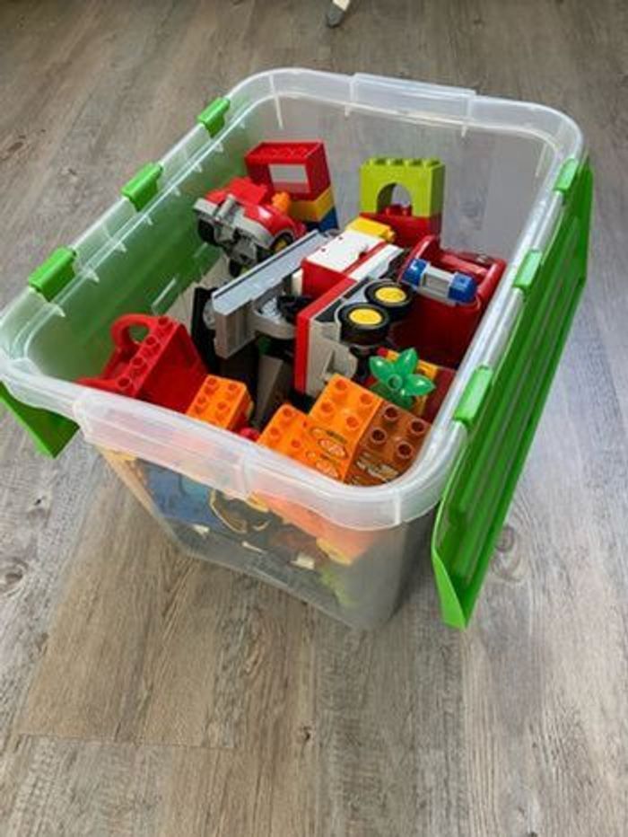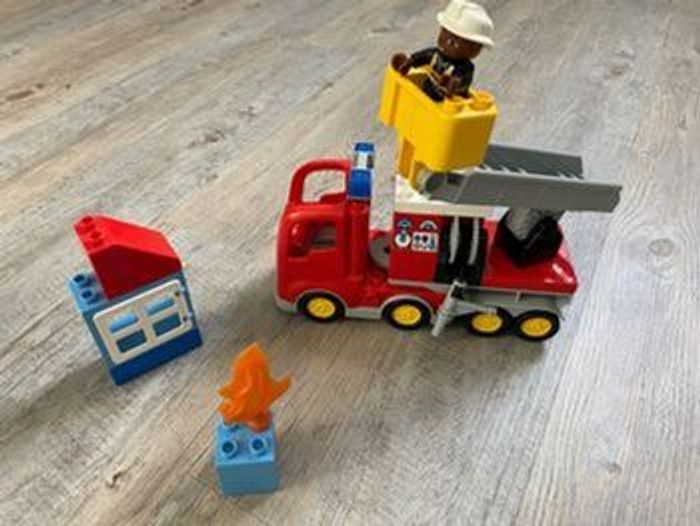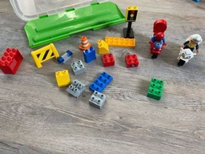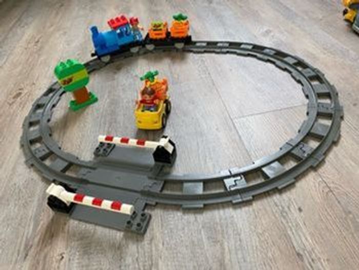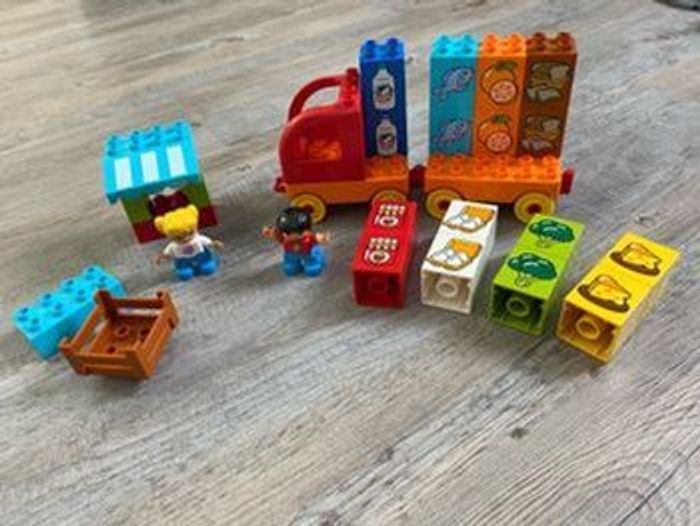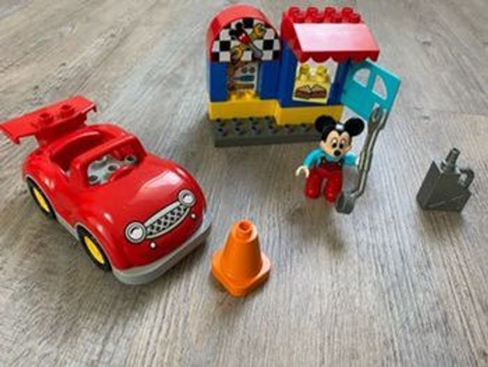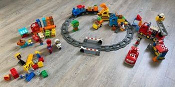 Caisse de duplo contient : - Mon premier train - Camion de pompiers - Petit garage Mickey - Camion benne avec pelleteuses - Marchande Et quelques pièces diverses dont une moto de police et la moto spider man. Vendu sans la caisse En bon état