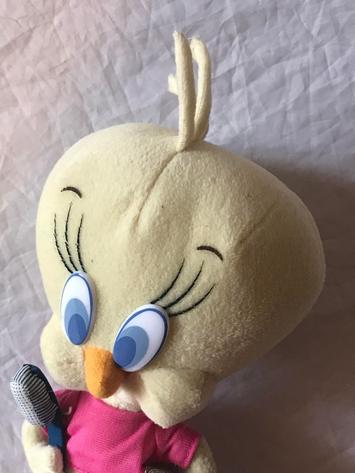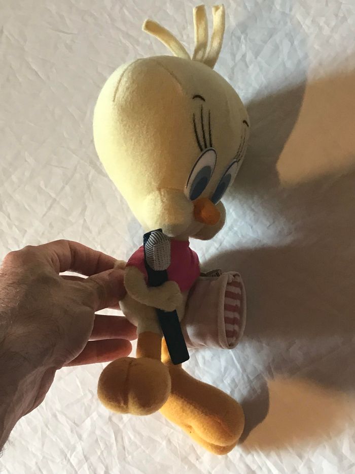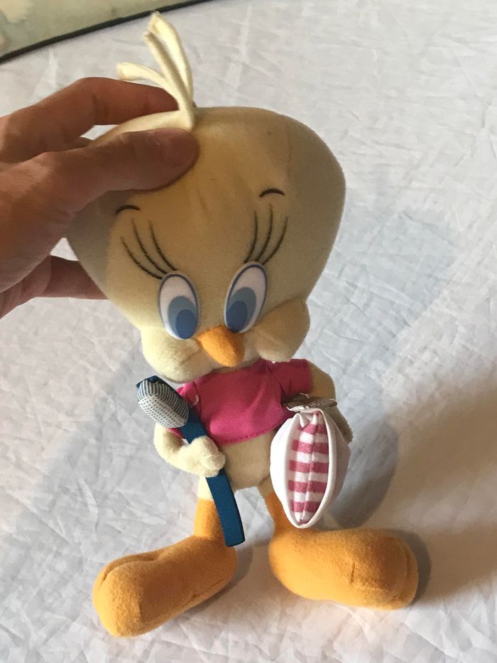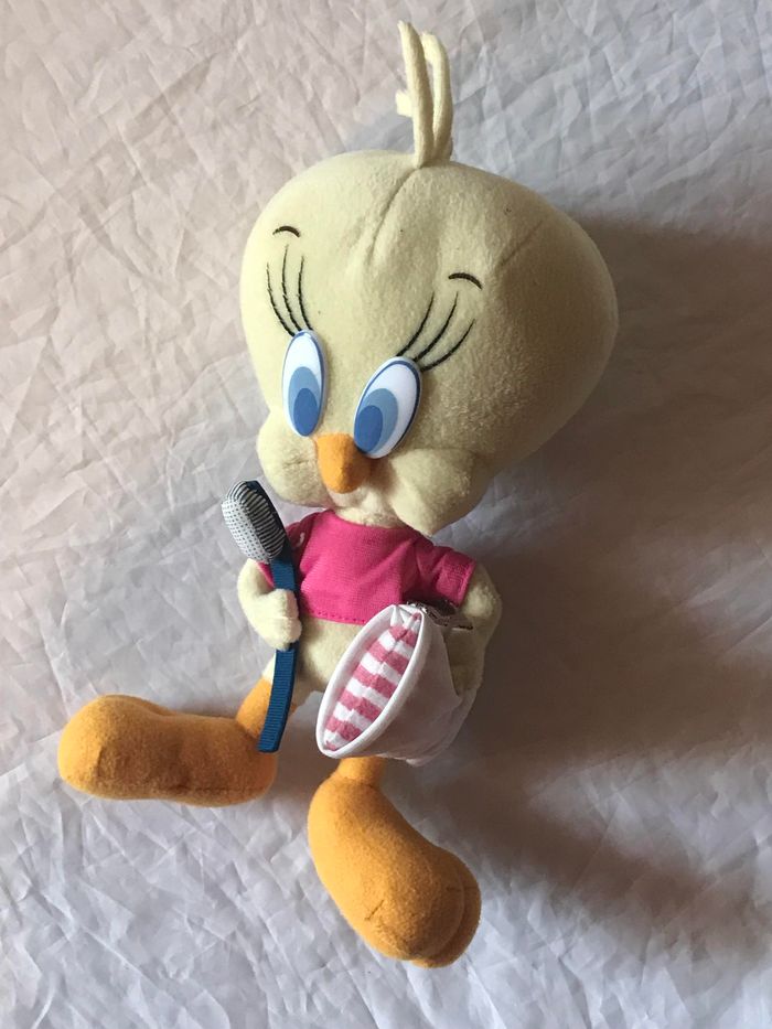 Petit Titi Jaune avec un Oreiller Blanc et une Brosse à Dents Bleue dans les Mains "Oiseau - Faune". Peluche pour les Petits Enfants et les Bébés. ☑ "Petit" Titi. ☑ Oreiller "Blanc". ☑ Brosse à Dents "Bleue". ☑ Oiseau - Faune. Spécifications: Dimensions du Titi: Env. 29 x 16 x 10 cm Couleur Dominante: Jaune Couleur des Pattes et du Bec: Orange Couleur de la Veste: Rose Couleurs de l'Oreiller: Blanc - Rose Couleurs de la Brosse à Dents: Bleu - Blanc Couleurs des Yeux: Blanc - Bleu Réf: pe46