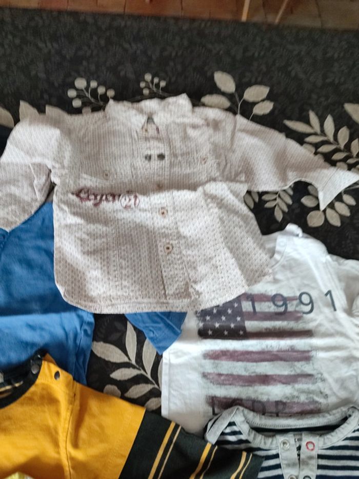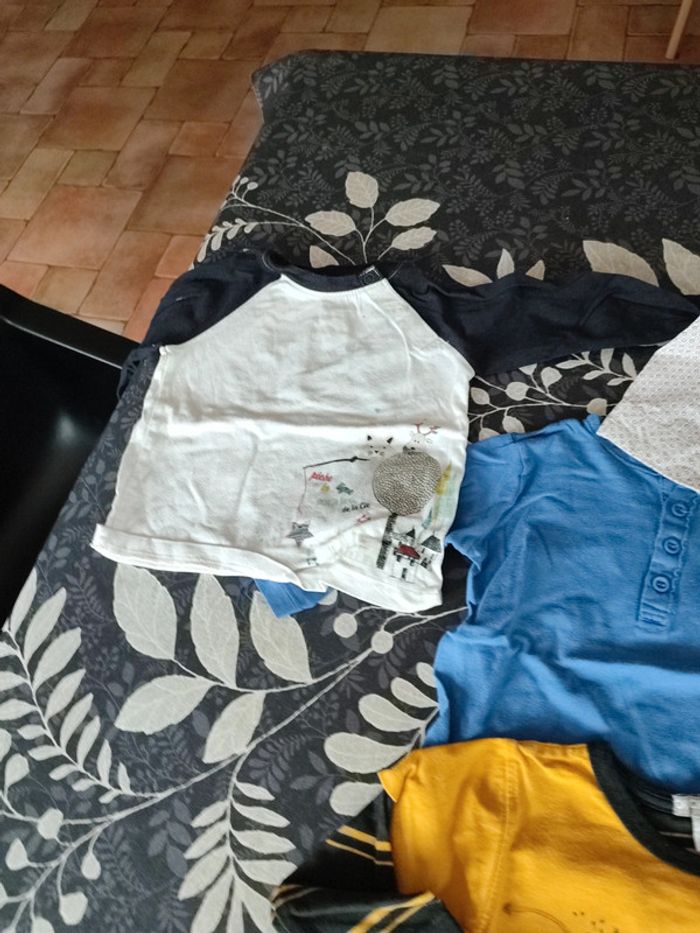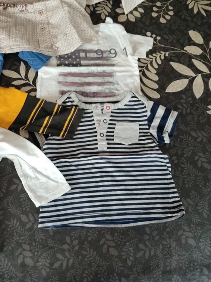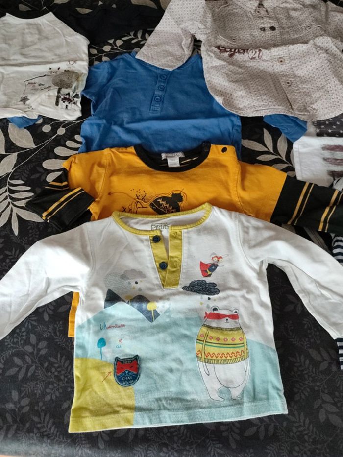 Lot 12 mois 3 tee shirt manches longues, un 4ieme offert celui en haut à gauche car tâches 1 chemise 2 tee shirts manches courtes Différentes marques orchestra, la compagnie des petits, tex,tao..