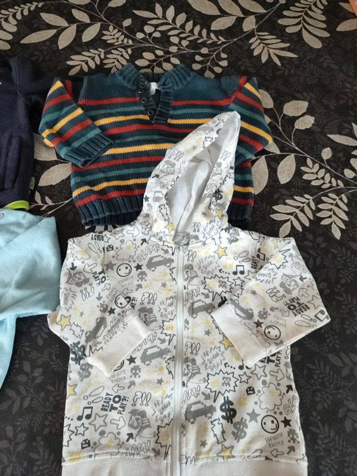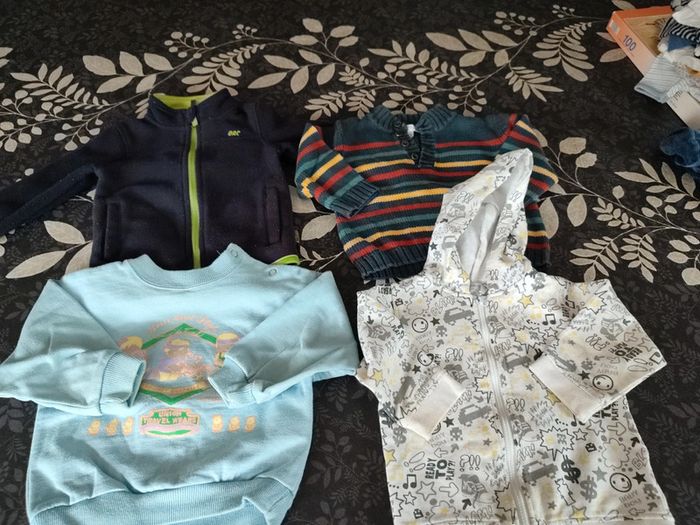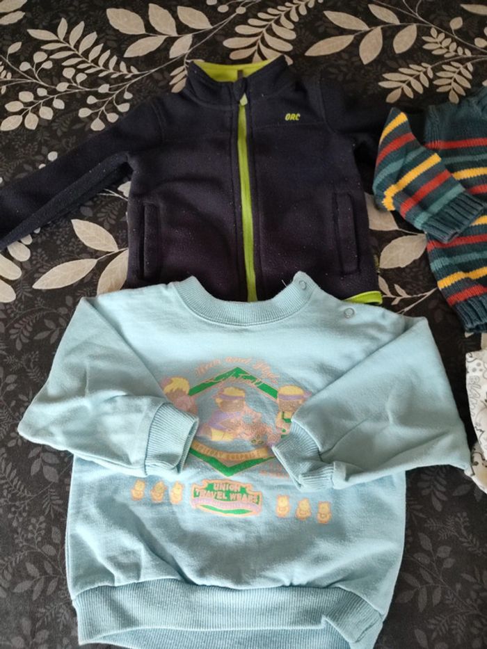 2 gilets dont 1 à capuche, quelques peluches sur le polaire 2 pulls Différentes marques orchestra, kitchoun, kimbaloo