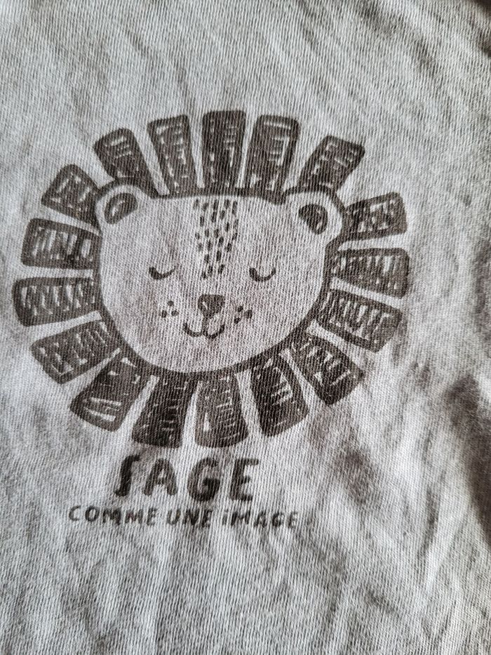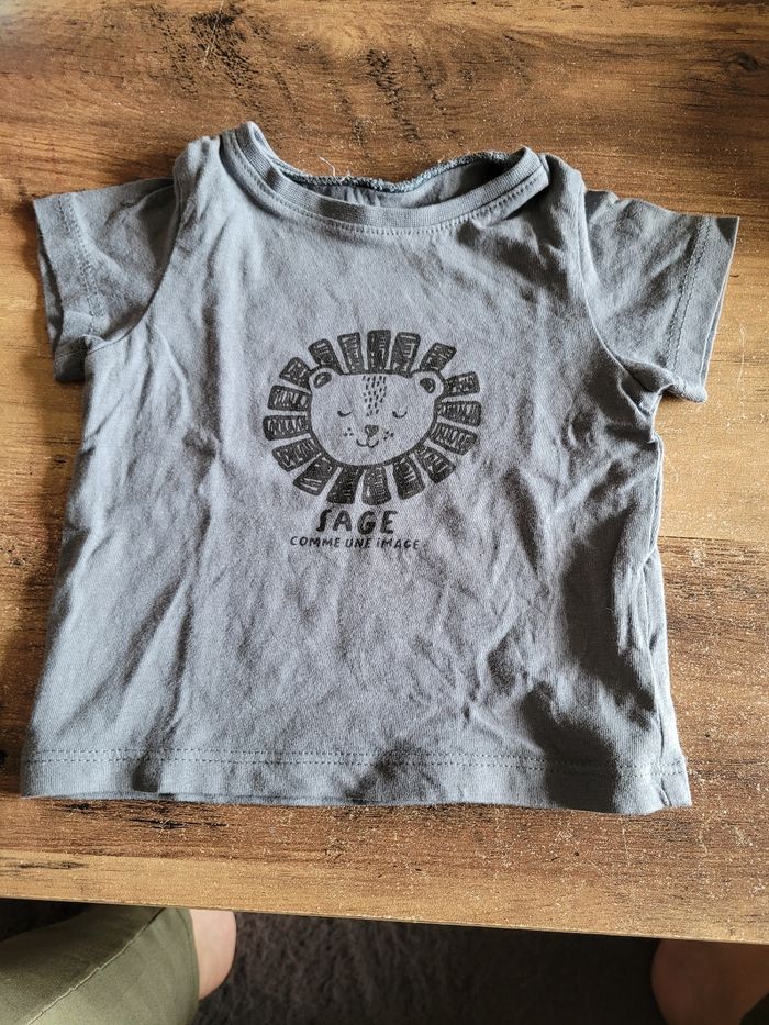 Petit T-shirt Manche court Couleur bleu gris Dessin lion Écrire sage comme une image Taille 3 mois Mi saison Voir tous saison Matière 100% coton