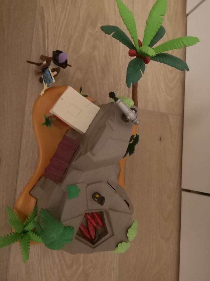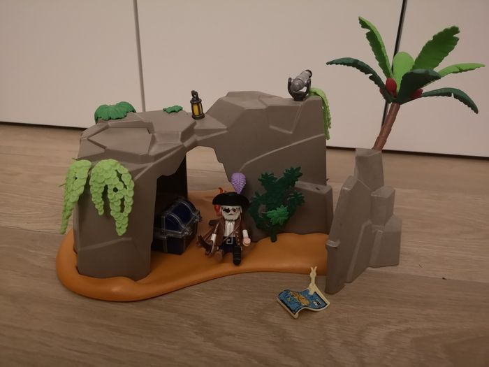 Repère de pirates avec un personnage, un canon lanceur de projectile, coffre avec un trésor, carte, lanterne, lampe magique et munitions.