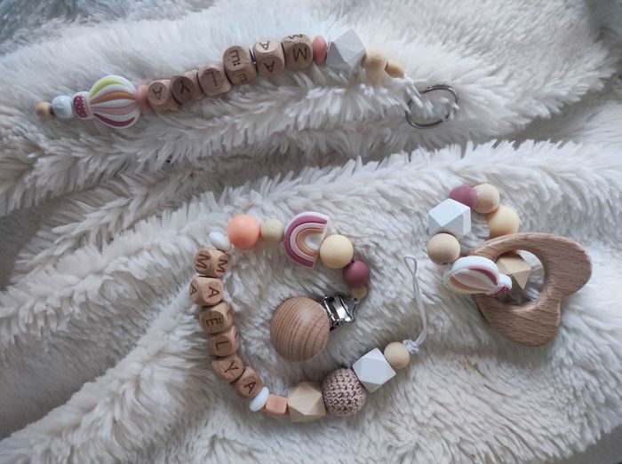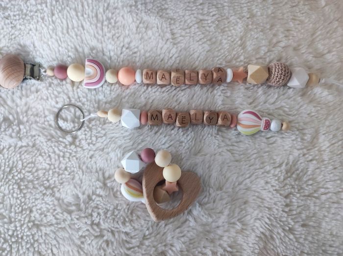 Vend lot Attache-sucette, hochet et porte-clef assorti ou à l'unité. 11€ l'attache sucette 9€ le hochet ou 10€ le porte clefs soit 30€ l'ensemble.