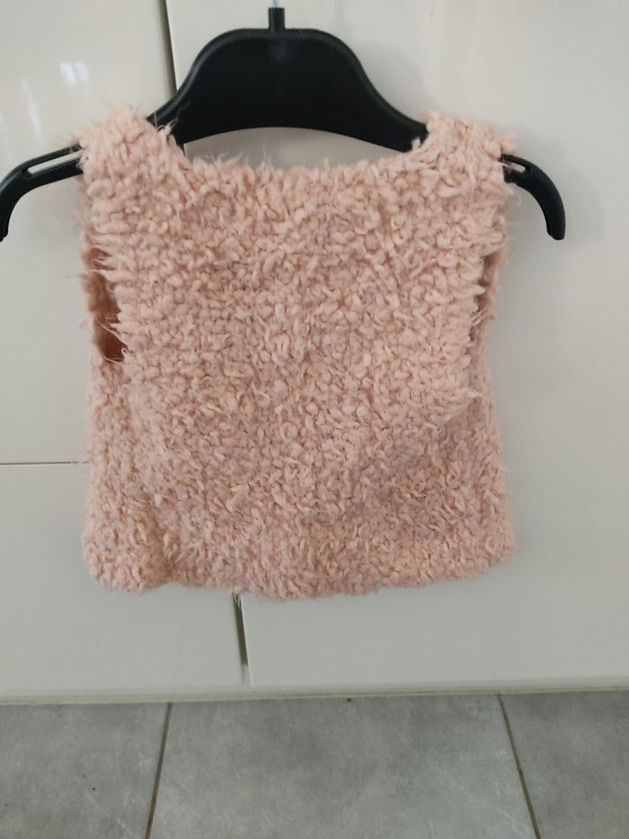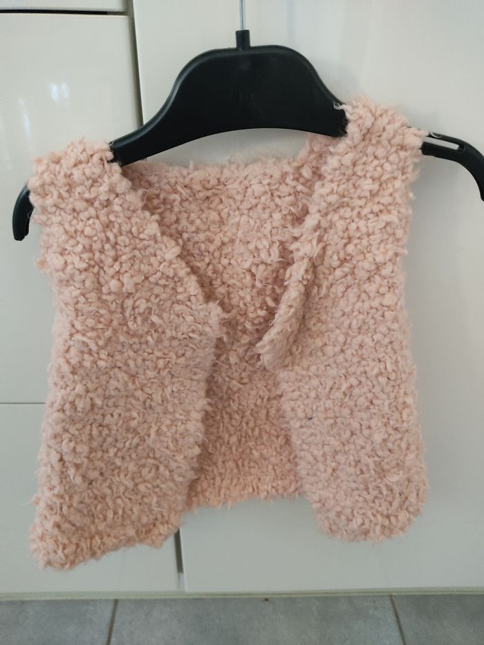 Gilet fille sans manches tricoté main. Très doux. Pas de taille mais je l évalue à du 9 mois. Style "laine mouton". Rose pâle