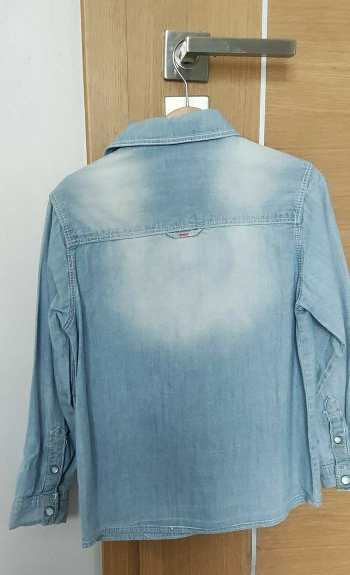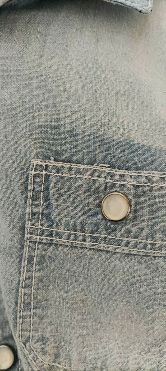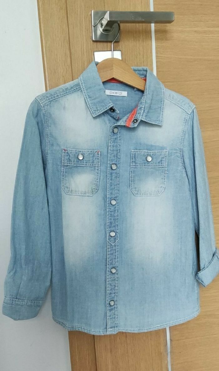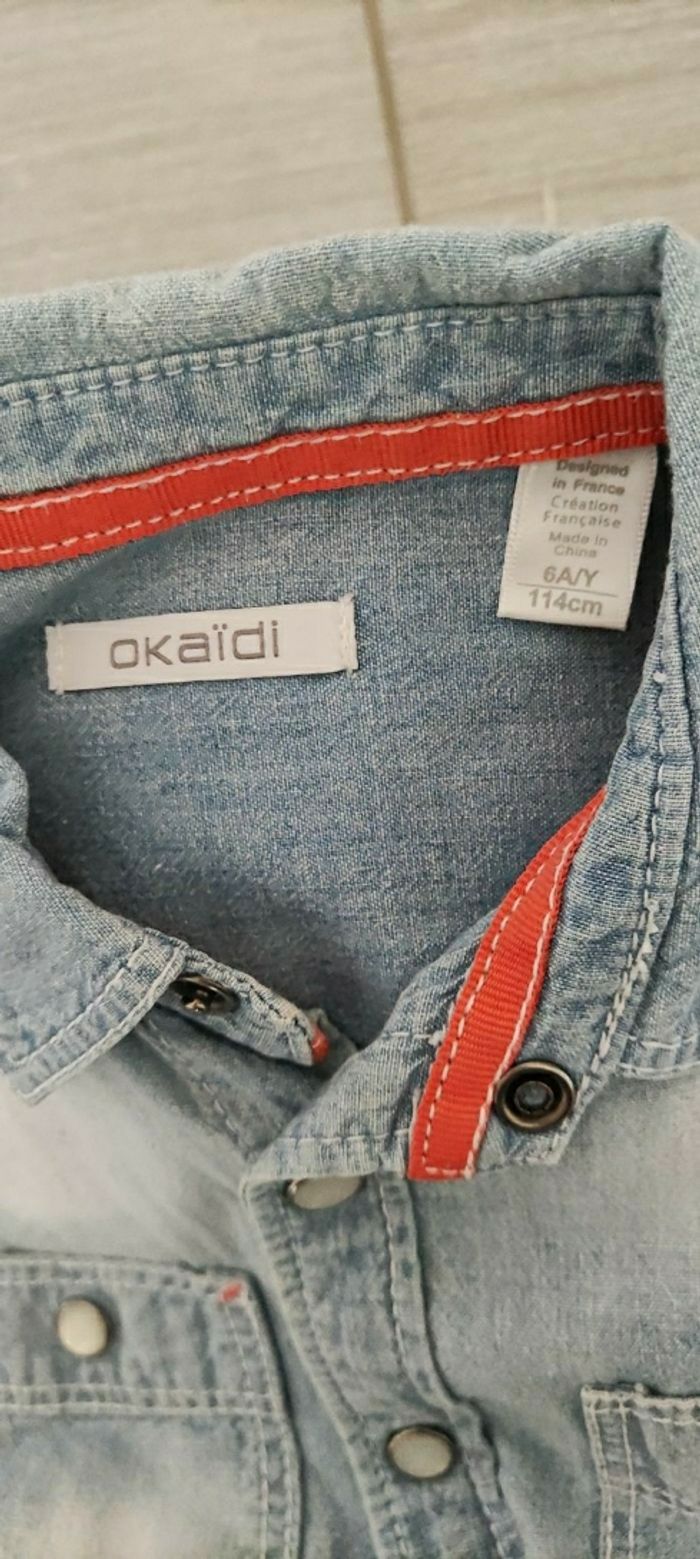 Chemise en jean souple, bleue claire. Pour garçon. Taille 6 ans. Marque Okaïdi. Détail des petites pressions nacrées qui rend la chemise originale.