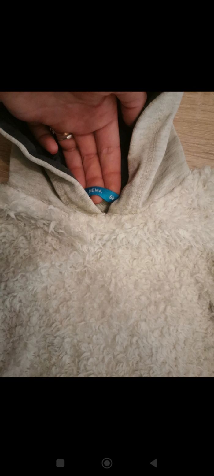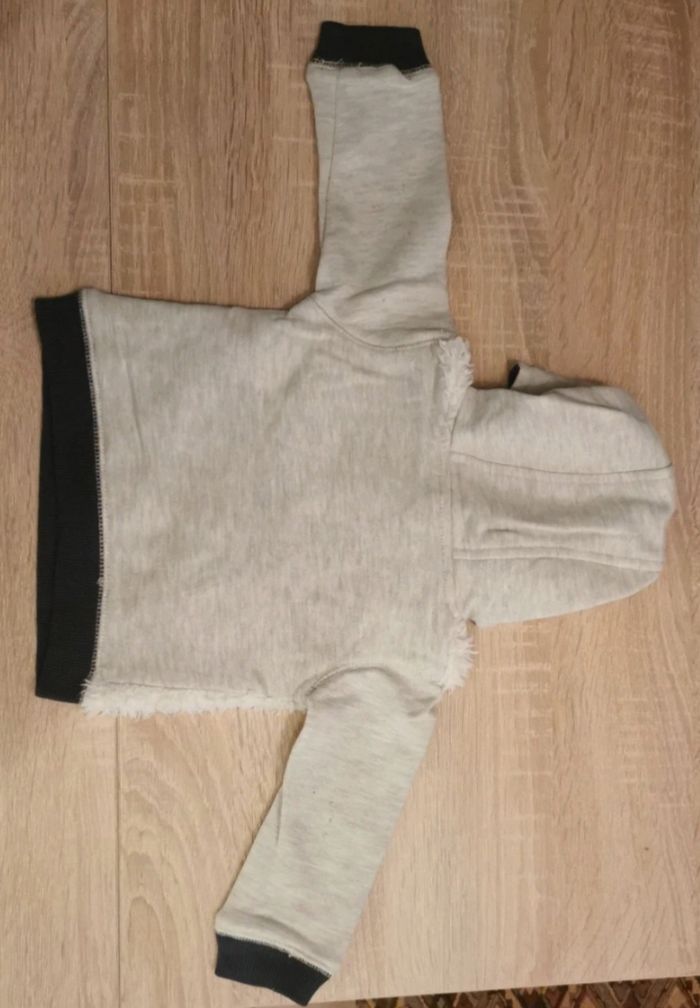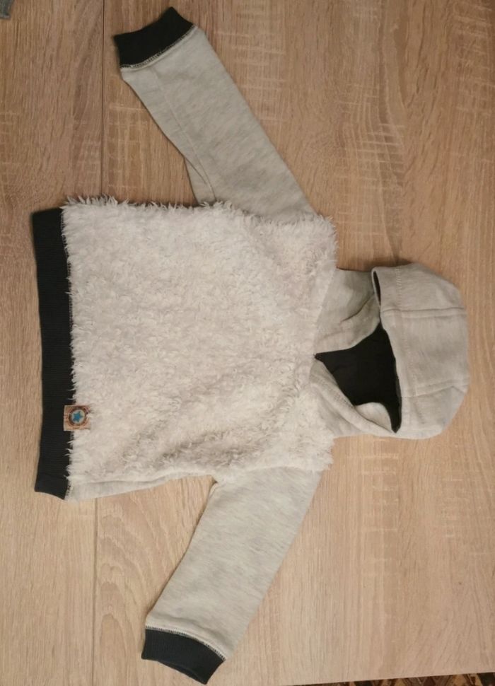 Sweat à capuche gris et blanc avec le devant en laine. En très bon état même si porté quelques fois. Taille 6 mois (68cm)