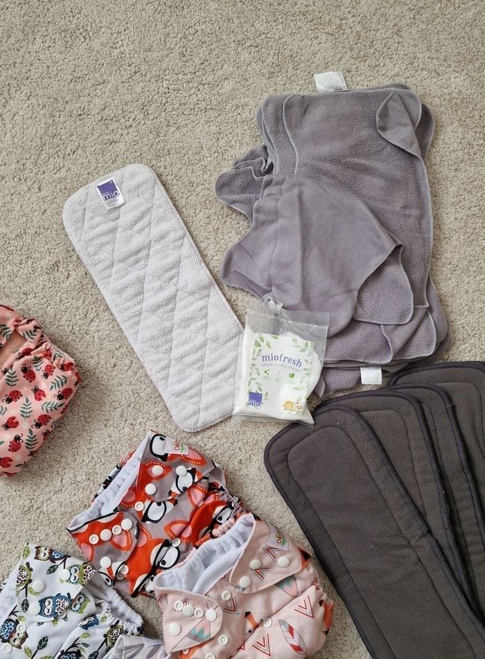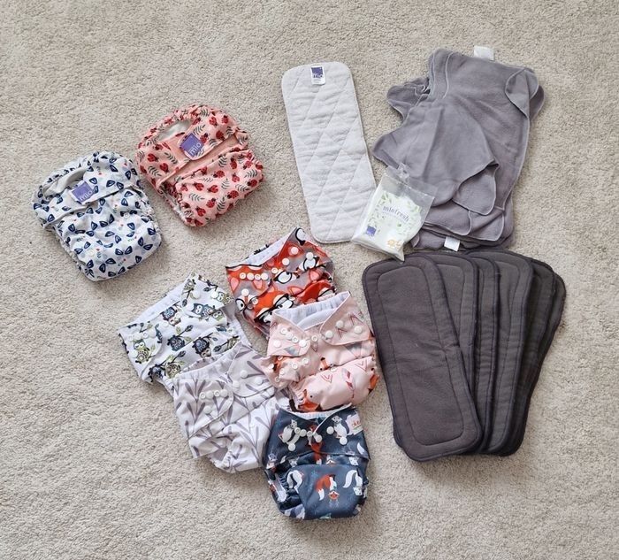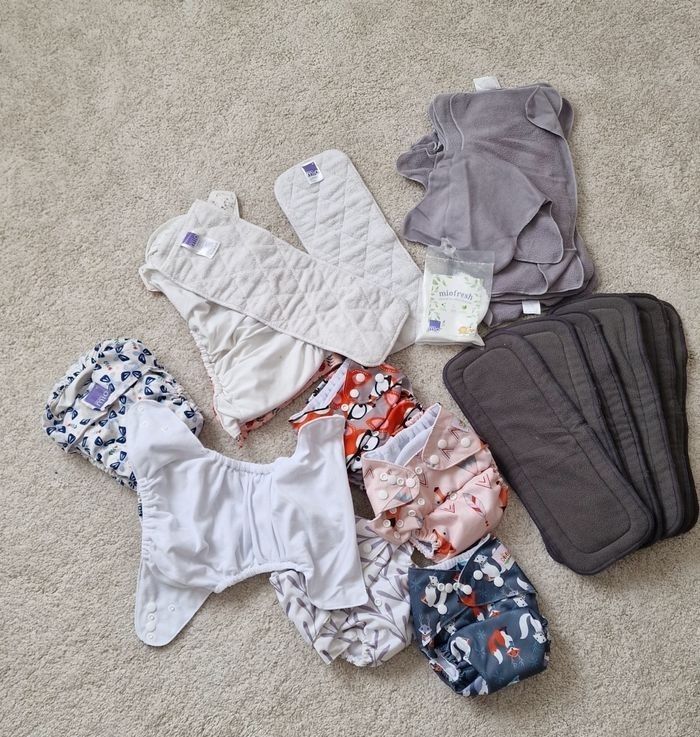 Lot de couches lavables comprenant : - 2 couches bambino mio avec l'insert attaché - 5 couches (marques diverses), sans insert attaché - 6 inserts en bambou - 1 insert bambino mio supplémentaire - 15 voiles lavables en polaire État : achetées neuves, utilisé 1 ou 2 fois seulement. 🎁 Offert : une pochette de lessive miofresh bambino mio