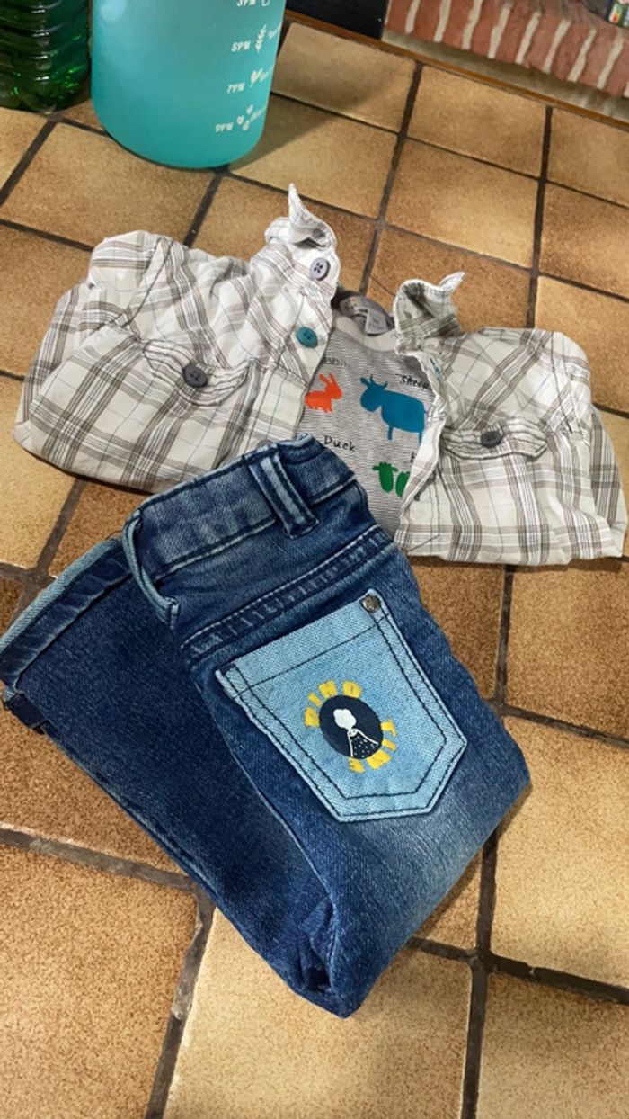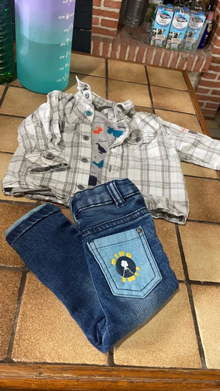 Chemise et teeshirt de la marque Kitchoun en taille 9 mois Jean de la marque orchestra taille 9 mois Bon état