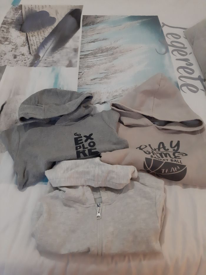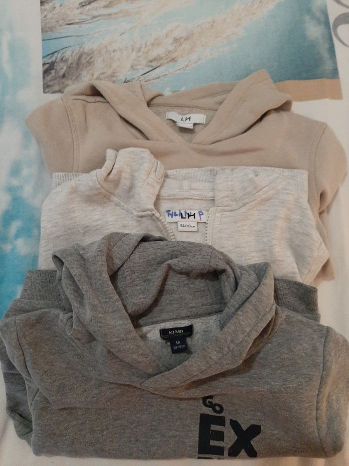 Lots de sweats 5 ans En bon état. Un gris de chez kiabi le beige et la veste grise de chez la halle.