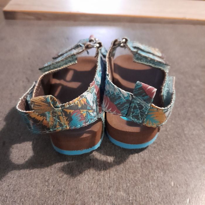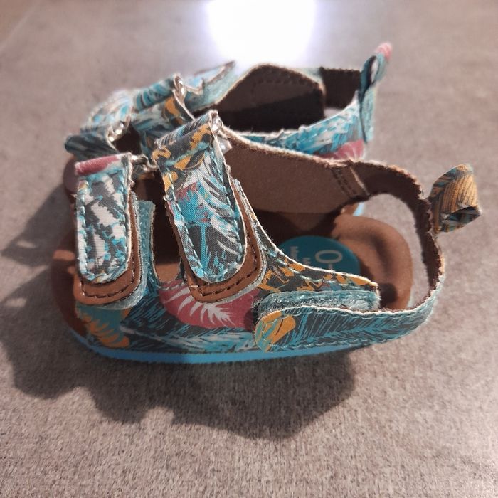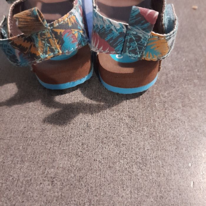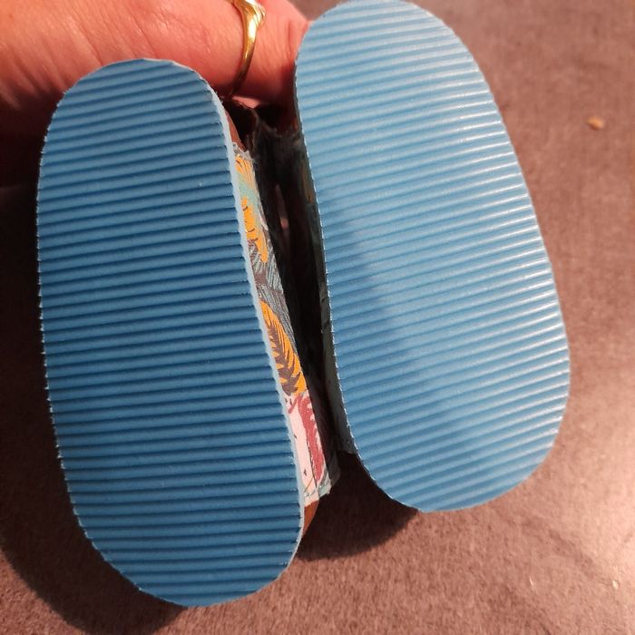 Sandalettes, taille 0-3 mois bleues, motifs florales comme neuves, longueur 10 cm